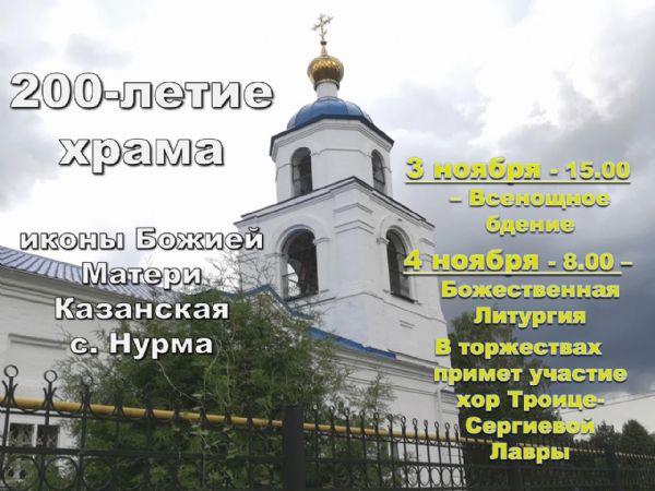 По благословению митрополита Йошкар-Олинского и Марийского Иоанна к 200-летию храма Казанской иконы Божией Матери села Нурма, а также ко Дню народного единства, 4 ноября в 15:00 в Православном центре Йошкар-Олы состоится выступление хора Троице-Сергиевой лавры под управлением главного регента лавры иеромонаха Нестора (Волкова).
