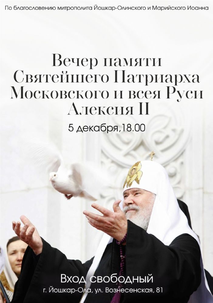 В пятницу, 5 декабря, в день блаженной кончины Святейшего Патриарха Московского и всея Руси Алексия II, в г. Йошкар-Оле состоится вечер памяти Патриарха.