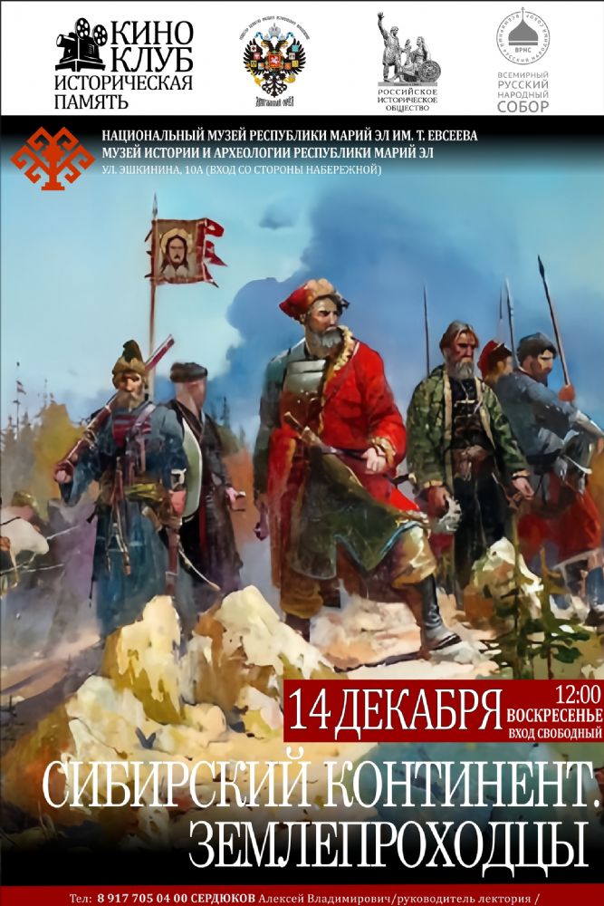 14 декабря (воскресенье) в 12:00 в Музее истории и археологии (Йошкар-Ола, ул. Эшкинина, дом 10-а, вход со стороны набережной) состоится показ историко-документального фильма «Сибирский континент. Землепроходцы ».
