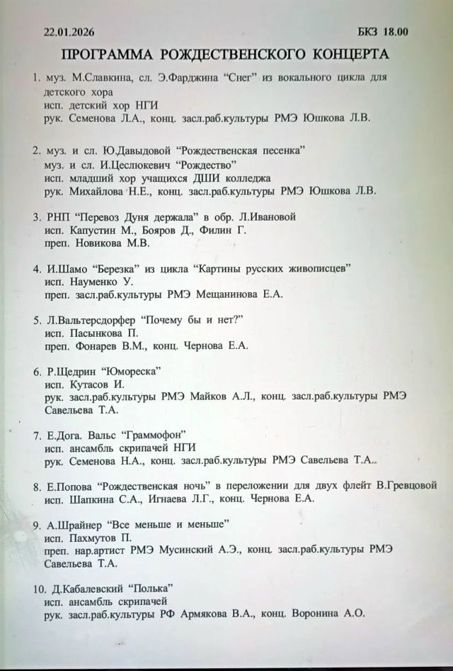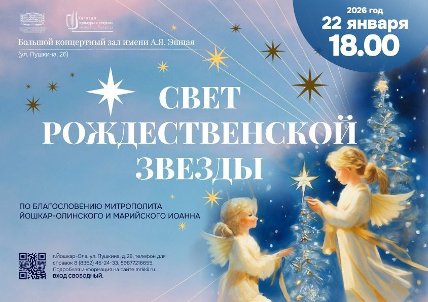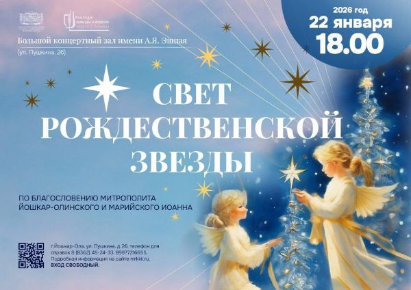 22 января в 18.00 часов в колледже культуры и искусств им. И.С. Палантая г. Йошкар-Олы состоится традиционный Рождественский концерт "Свет Рождественской звезды".