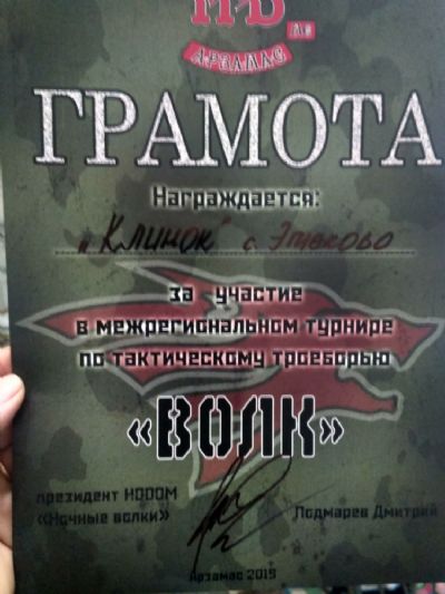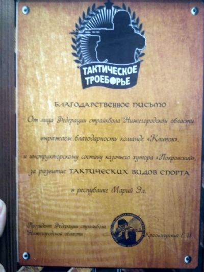От лица Федерации страйкбола команде «Клинок» из Эмеково было вручено благодарственное письмо и памятный приз, как первой команде по тактическому троеборью в своём регионе.