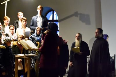 Песнопения повечерия исполнял хор «Благовест» под руководством регента Татьяны Черновой. Кондак после 6 песни канона исполнили клирики собора иереи Никифор Захаров и Евгений Самойлов, дьяконы Андрей Дружинин и Игорь Коваль.