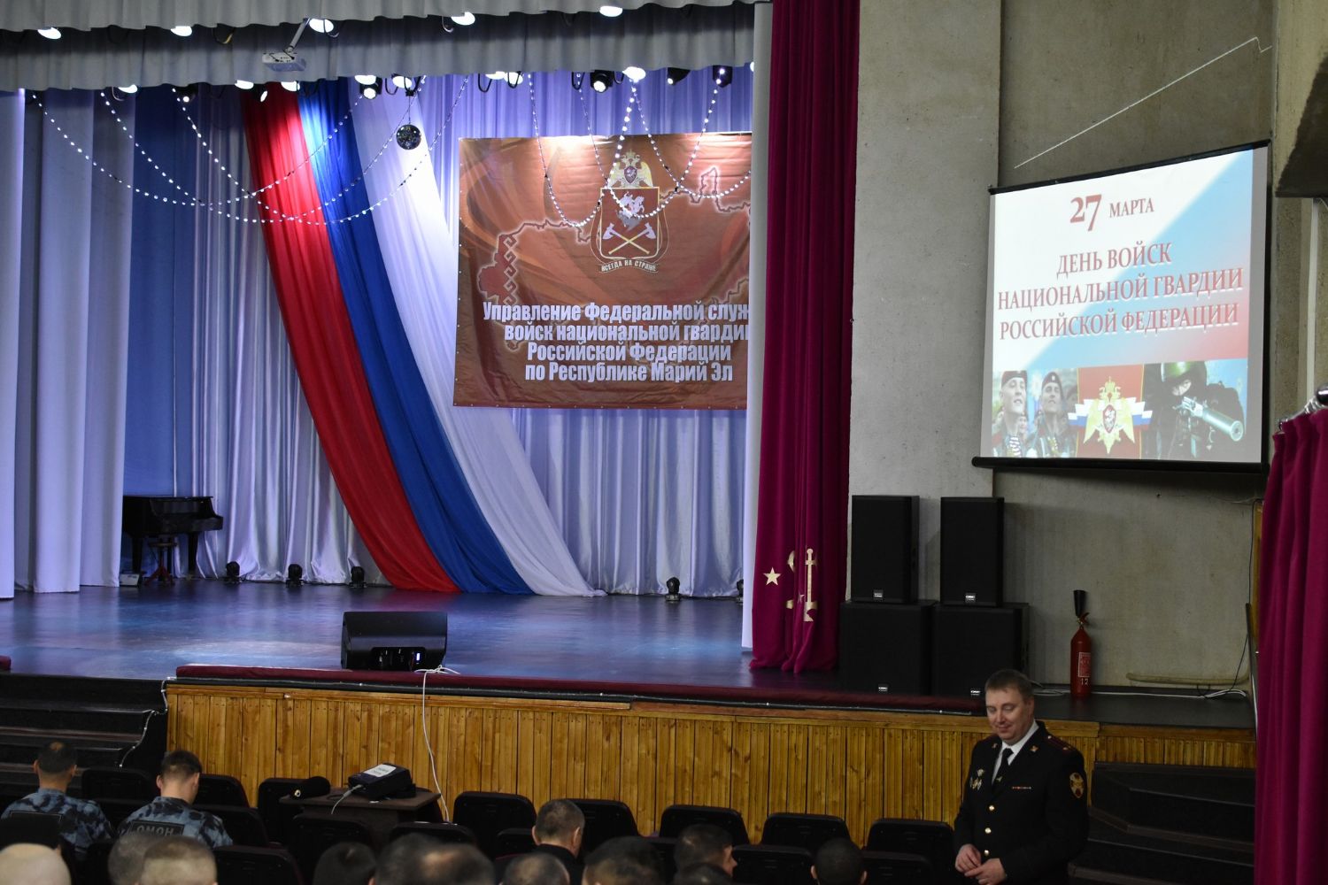 С поздравлениями выступили руководитель отдела Росгвардии по республике Марий Эл полковник полиции Бурдо А. Б., заместитель председателя правительства Воронцов С. А., председатель регионального отделения межрегиональной общественной организации ветеранов войск правопорядка Приволжского федерального округа по республике Марий Эл Головин А. С.