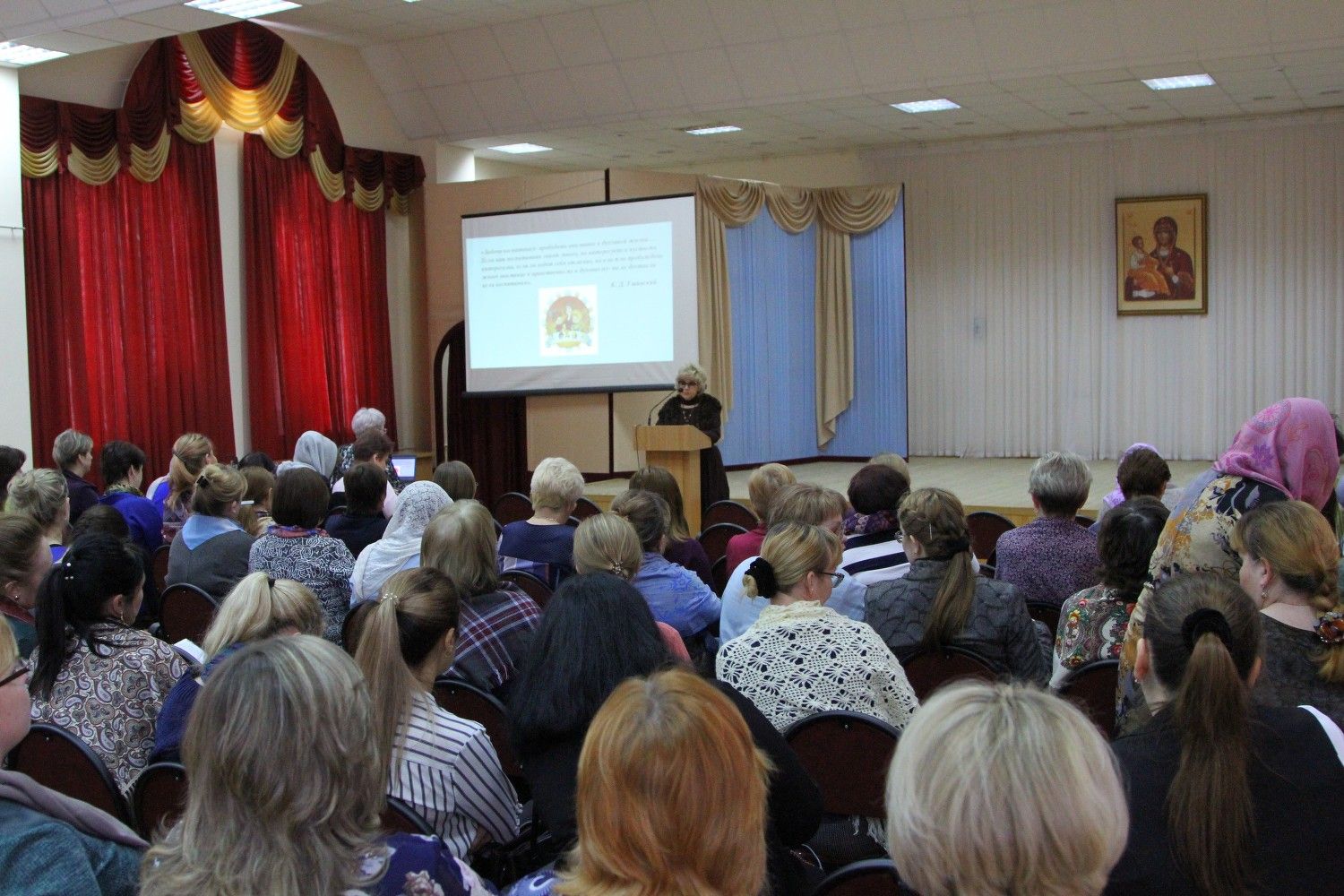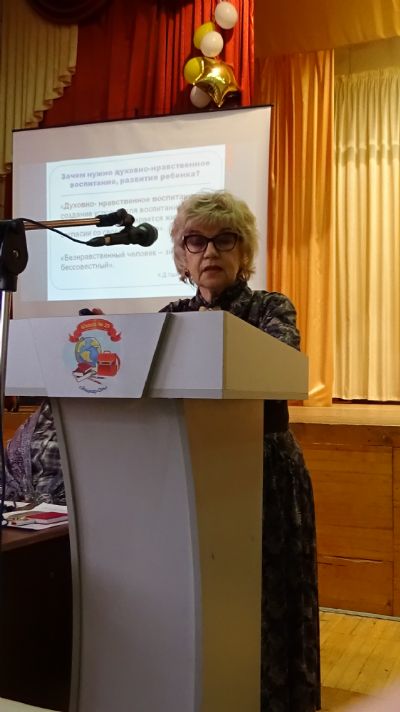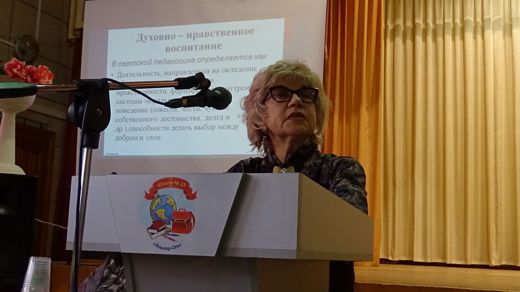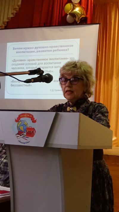 С основным докладом, посвященным духовно-нравственному воспитанию обучающихся в современных условиях, выступила Сарынина Виктория Яковлевна, сотрудник ОРОиК Йошкар-Олинской и Марийской епархии, член-корреспондент Международной академии наук педагогического образования, почетный работник общего образования РФ, заслуженный работник образования РМЭ. Она особо подчеркнула, что духовности нельзя научить насильно, это тонкий диалог, прежде всего, с родителями обучающихся. И это, конечно, диалог с детьми. Нам необходимо учитывать их мнения и понимать их запросы. Виктория Яковлевна обратила внимание на роль ОРКСЭ (Основы религиозных культур и светской этики) в воспитании подрастающего поколения и подчеркнула, что это самая актуальная и значимая инновация в российской школе. Здесь ничего не придумывается заново, мы возвращаем утраченное. Традиционное религиозно-нравственное образование школьников – это педагогическая аксиома. Об этом говорил еще К.Д. Ушинский. Введение ОРКСЭ ярко показало лучшие качества нашего учительства и еще покажет, когда мы перейдем к преподаванию религиозных культур и светской этики по остальным годам обучения.