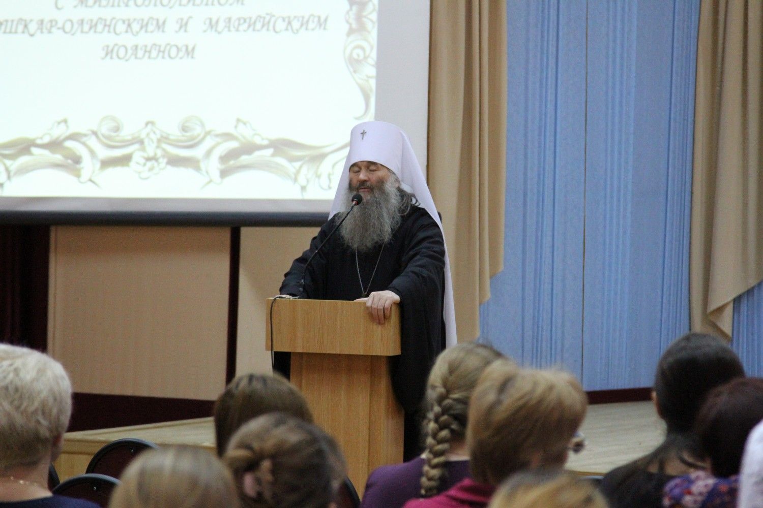 Впервые с участниками семинара встретился митрополит Йошкар-Олинский и Марийский ИОАНН. Он обратил внимание учителей на ту роль, которую им определило нынешнее время. Сколько нам с вами приходится перестраиваться в учебном процессе. Системы нормальной, естественной, которая была на Руси тысячи лет и в Советском Союзе на 90% оставалась, уже не остается, а мы все ищем, перестраиваемся. Но все равно мы вернемся к прежней системе, потому что знания не надмевают сердце. Наши дети, как никогда, испытывают то внешнее давление, которое на них, на окружающий мир, в семье, в общении друг с другом давлеет. Это требует от нас духовной собранности. Внешний пример, негативный, все больше и больше у наших детей забирает свободу выбора. Нашими детьми манипулируют, управляют. Нам надо вернуться к тем истокам, которые были у нас на Руси, в России, Союзе. У нас ребенок все время должен, а он вырастает и говорит: «Вот вы мне все должны». Сменились ценности у наших детей. Они нам говорят: «Нас научили, что материальное – самое главное». Вот поэтому, например, 90% студентов работает, а 10% - только учатся. Даже в сельских школах на вопрос: для чего они ходят в школу? – отвечают: чтобы быть успешными! Мы должны дать ребенку прививку добра, чтобы он понимал, почему доброму человеку живется лучше в этом греховном мире. Господь создал нас добрыми, и мы должны быть носителями добра. Именно знания Основ Православной культуры станут для ребенка стеной, защищающей его от зла.