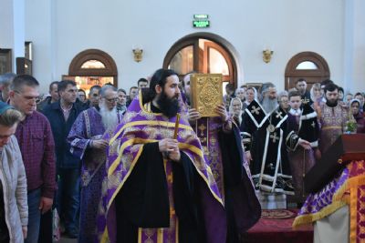 Затем была вознесена молитва перед Святым Крестом ко Господу Распяту и при пении стихиры Великой Пятницы «Приидите ублажим Иосифа приснопамятного…» священство поклонилось Святому Кресту.