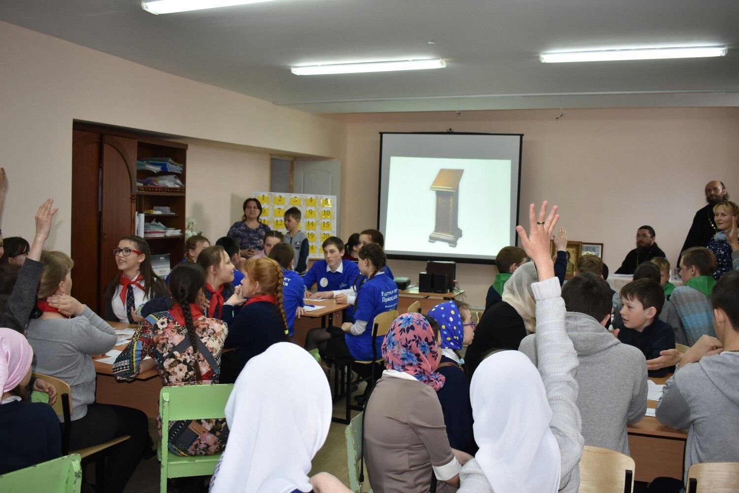 В уютном зале Воскресной школы «Преображение» собралось семь команд знатоков православной культуры: команды «Добрята» и «Искорки добра» прихода храма Архистратига Божия Михаила п. Сернур, команда «Свечи» прихода храма Вознесения Господня п. Новый Торьял, команда «Свечи» прихода Крестовоздвиженского храма с. Кукнур, команда «Лампада» прихода храма Казанской Божией Матери с. Казанское, команда «Покров» прихода храма Покрова Пресвятой Богородицы с. Марисола, команда «Богатыри» прихода храма преподобномученика Андрея Критского с. Елембаево. Общее число участников составило 53 человека с 9 до 14 лет.