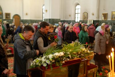 После литургии священство совершило славление у иконы праздника в центре храма - пропели тропарь, кондак и величание праздника. Затем всем, кто не смог освятить ветви вербы (вайи) на Всенощном бдении священники окропили ветви святой водой.