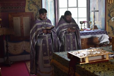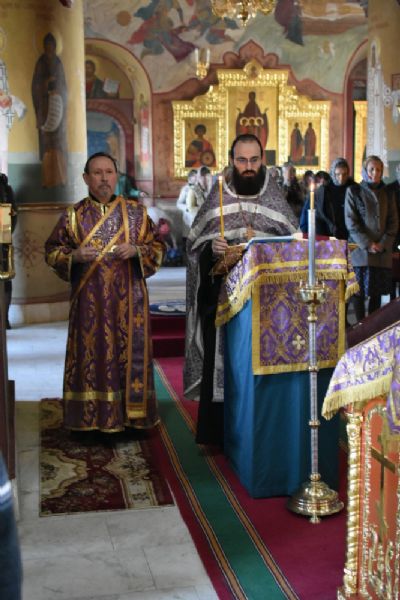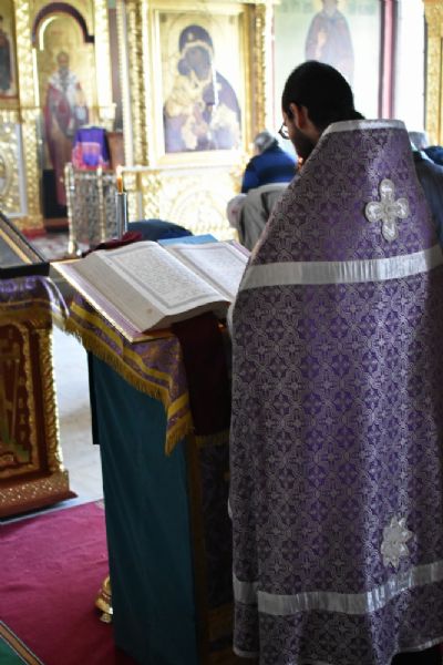 За Божественной литургией читались отрывки из книги Исход (2 глава) о бегстве Моисея в землю Мадиамскую, из книги Иова (2 глава) о страданиях праведного Иова и из Евангелия от Матфея (26 глава) о помазании Господа Иисуса благовонным миром в Вифании.