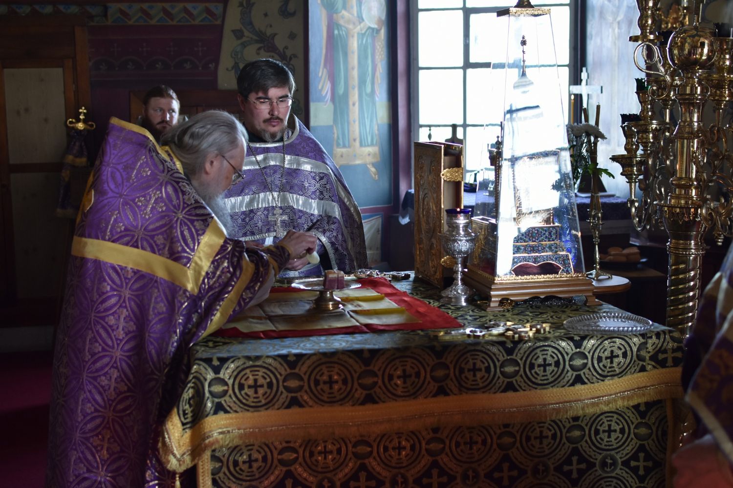 После чтения трех кафизм на утрене в алтаре Владыка прочитал Евангельский отрывок из Евангелия от Иоанна (12 глава) о страданиях, будущей славе и вере в Господа Иисуса Христа.