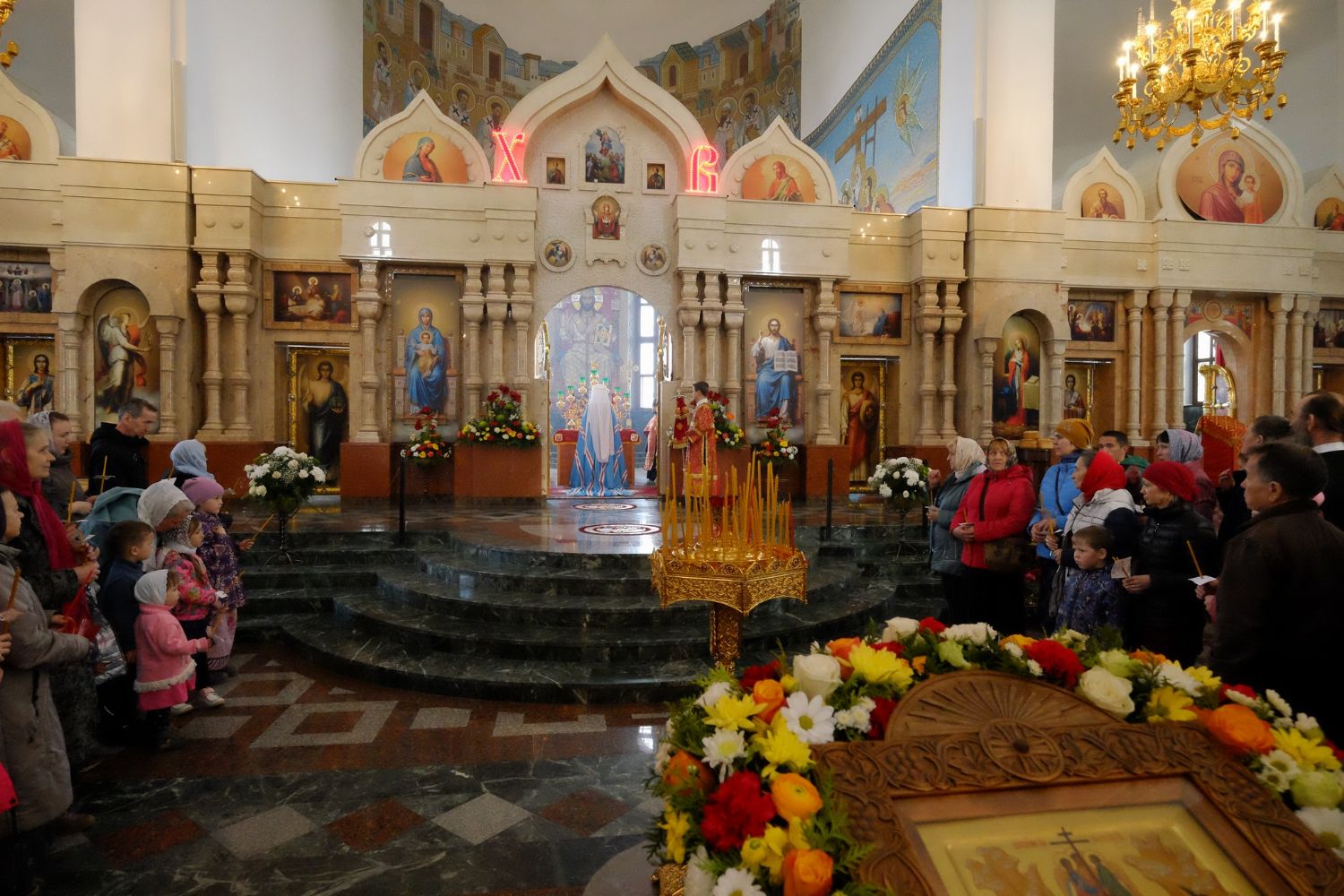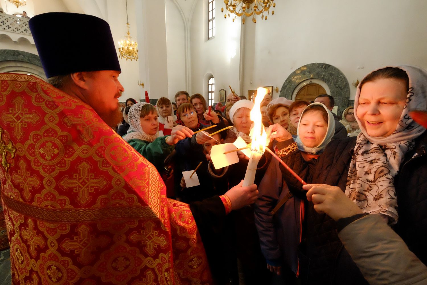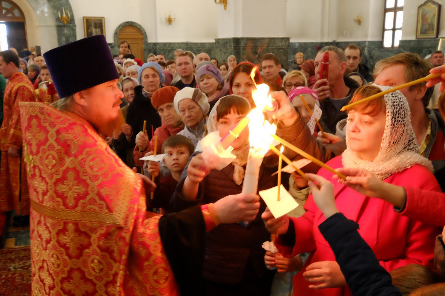 Перед началом Богослужения духовенство и верующие встречали Благодатный огонь, который был привезен из Храма Воскресения Христова (Гроба Господня) г. Иерусалима в Москву, а затем доставленный в Йошкар-Олинскую и Марийскую епархию.