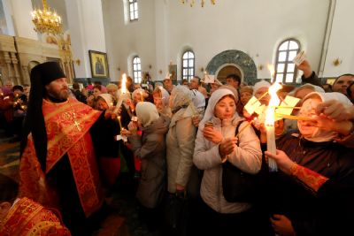 Величайшая святыня, которая только сутки назад появилась на Святой Земле теперь оказалась на Марийской земле. Из кафедрального собора Благодатный огонь разнесли по всем храмам, а прихожане унесли его в свои дома.