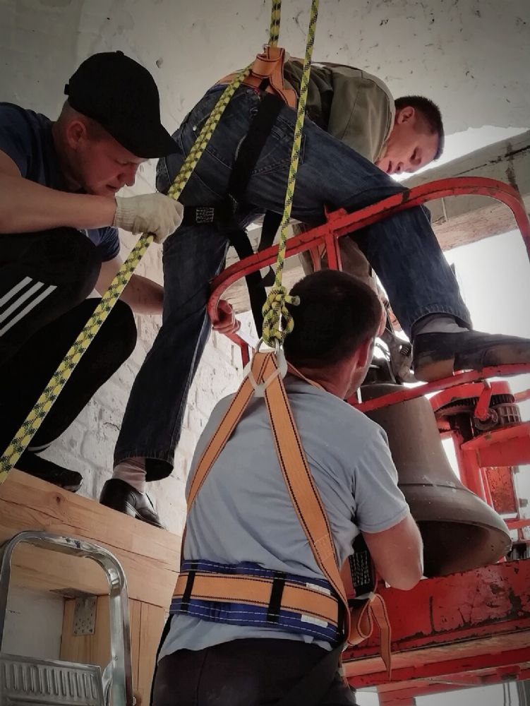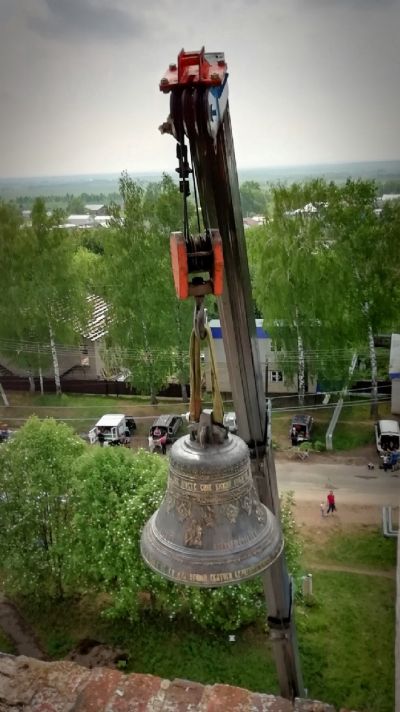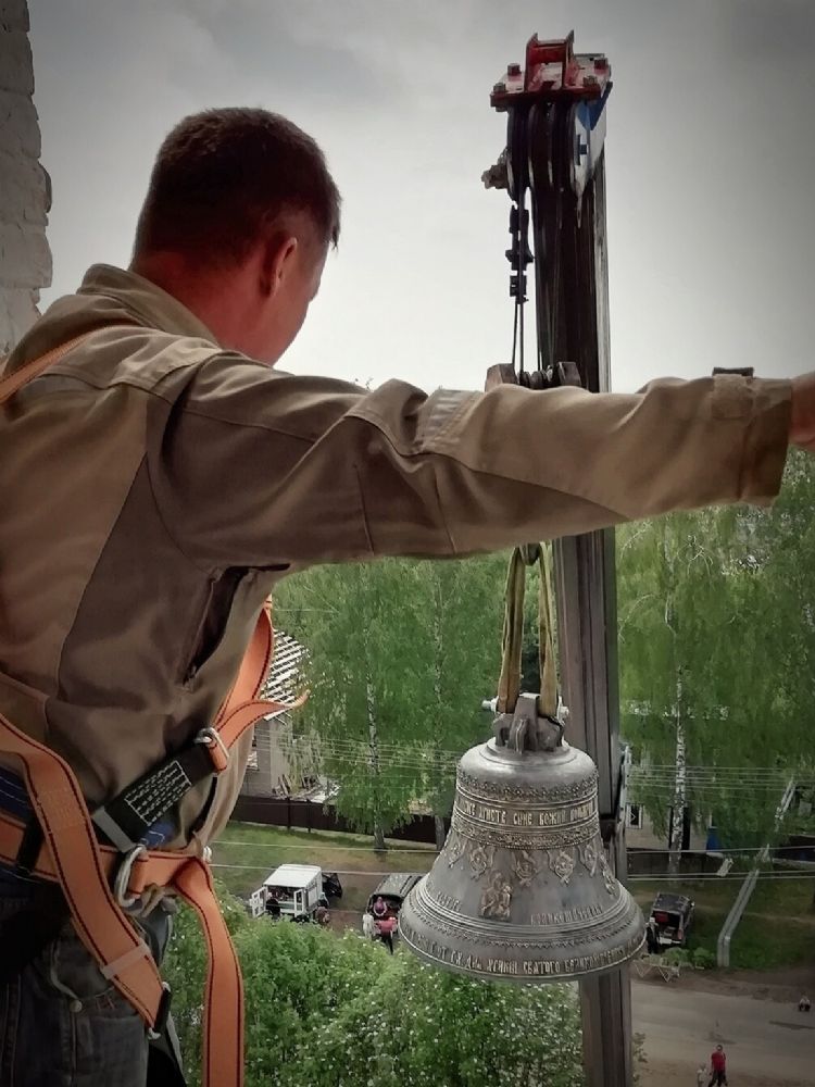 Профессионализм ребят, участвующих в работах по подъему и монтажу, нельзя не отметить. Словно часовой механизм, все четко и слажено выполняли свою работу. На подвеску автокрана прикрепили 230-килограммовый колокол и с ювелирной точностью, чтобы не задеть фасад церкви, подняли на звонницу. Тем временем под куполами работали другие. Они освобождали место для «новосела», аккуратно снимая служившие много лет колокола.
