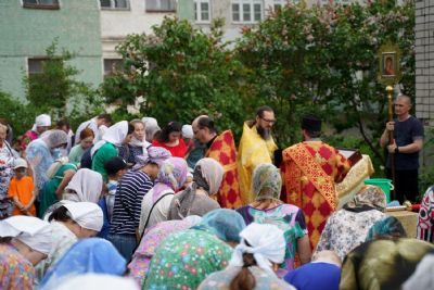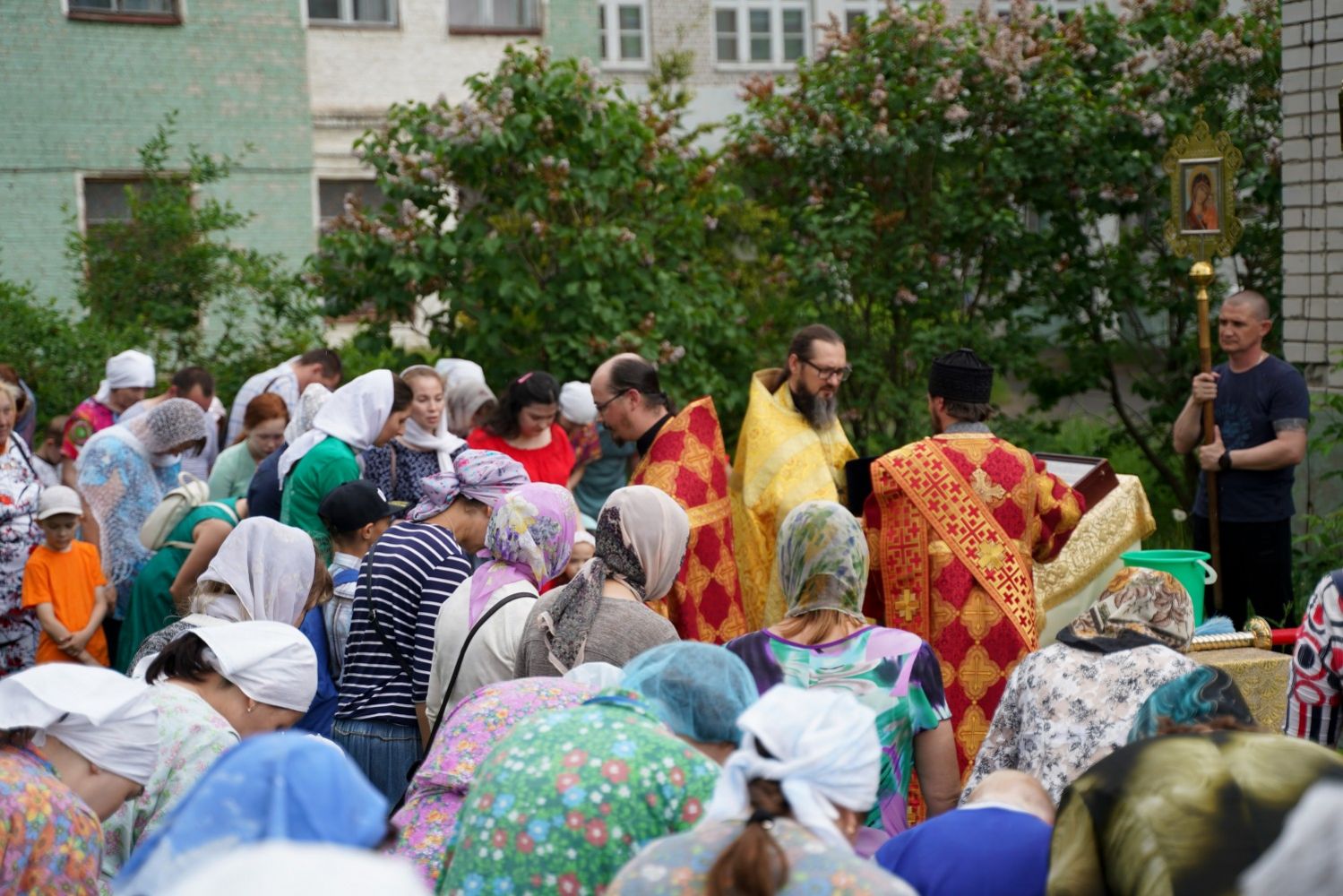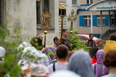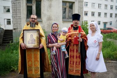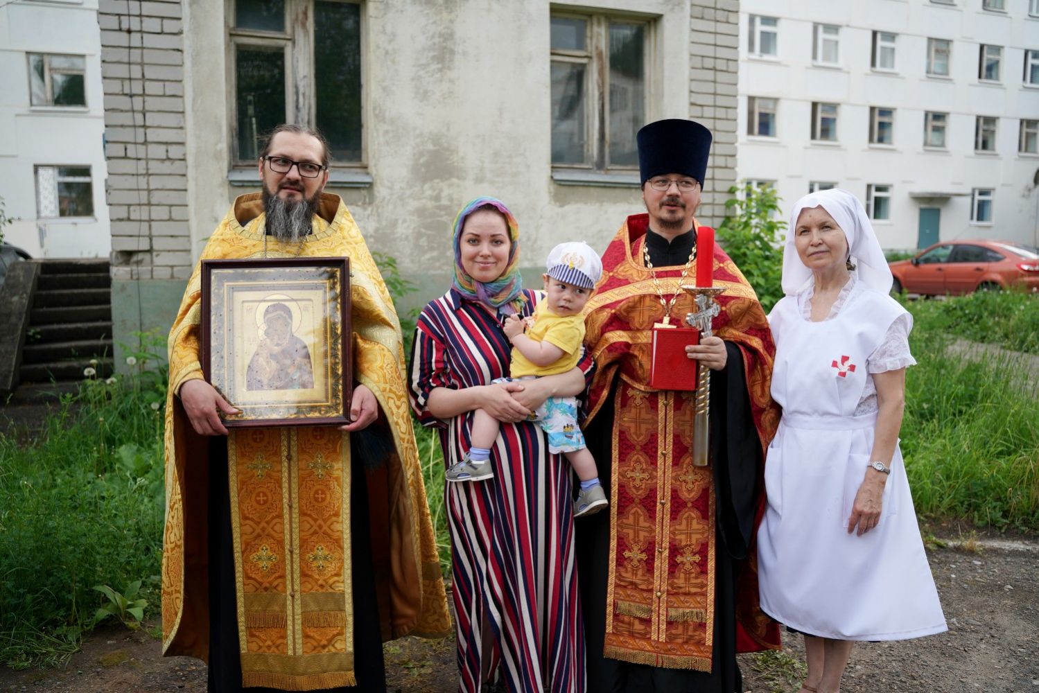 На территории Перинатального центра крестный ход встречал иерей Дмитрий Дьяков, ответственный за связь с общественностью, и сестра милосердия молебной комнаты данного учреждения Людмила Ямбердова. Был отслужен водосвятный молебен Феодоровской иконе Божией Матери, на котором вместе с крестоходцами молились и беременные женщины родильного отделения Перинатального центра. В крестном ходе приняли участие в том числе и семьи, получающие помощь в отделе социального служения епархии. После молебна детям из этих семей были разданы билеты на бесплатное посещение аттракционов в Парке культуры.