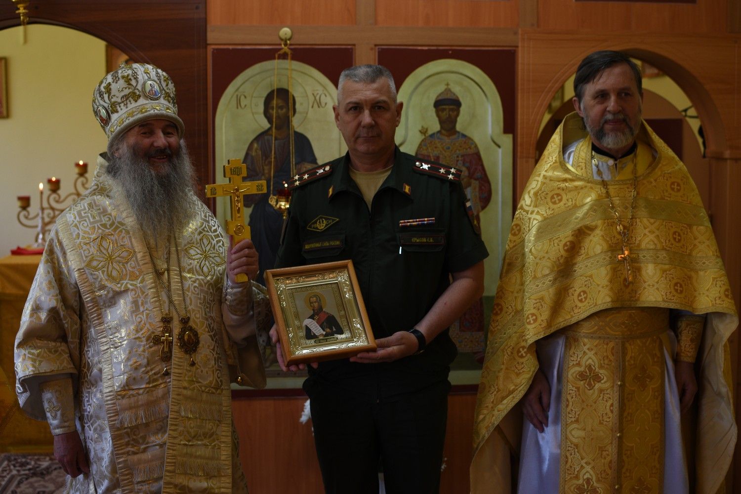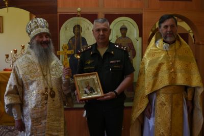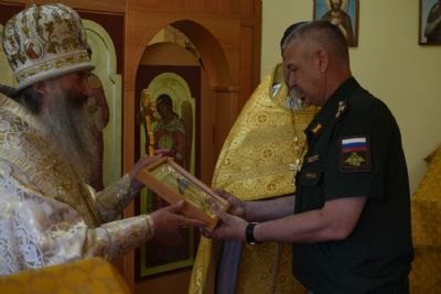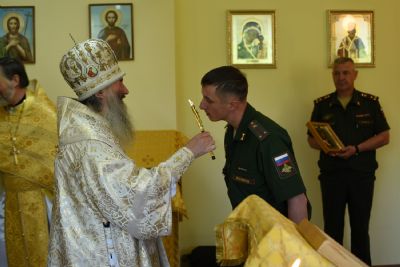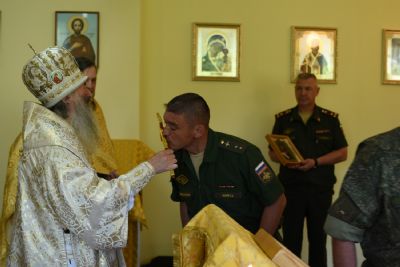 После Литургии священство в центре храма вознесло молитву святителю Луке и пропело величания святителю и Вознесению Господню. Затем Владыка обратился к собравшимся с проповедью о Крымском святителе, рассмотрев его служение во время Великой Отечественной войны, как врача и архипастыря. Продолжая архипастырское наставление, митрополит Иоанн подарил икону святого праведного Феодора Ушакова командиру части и рассказал о примере твердой веры святителя Луки (Войно-Ясенецкого) во время гонений.
