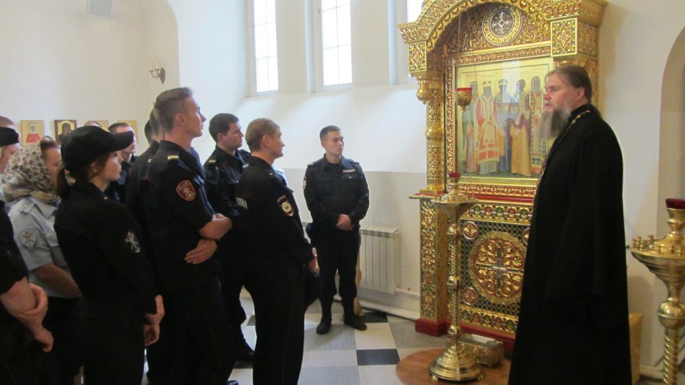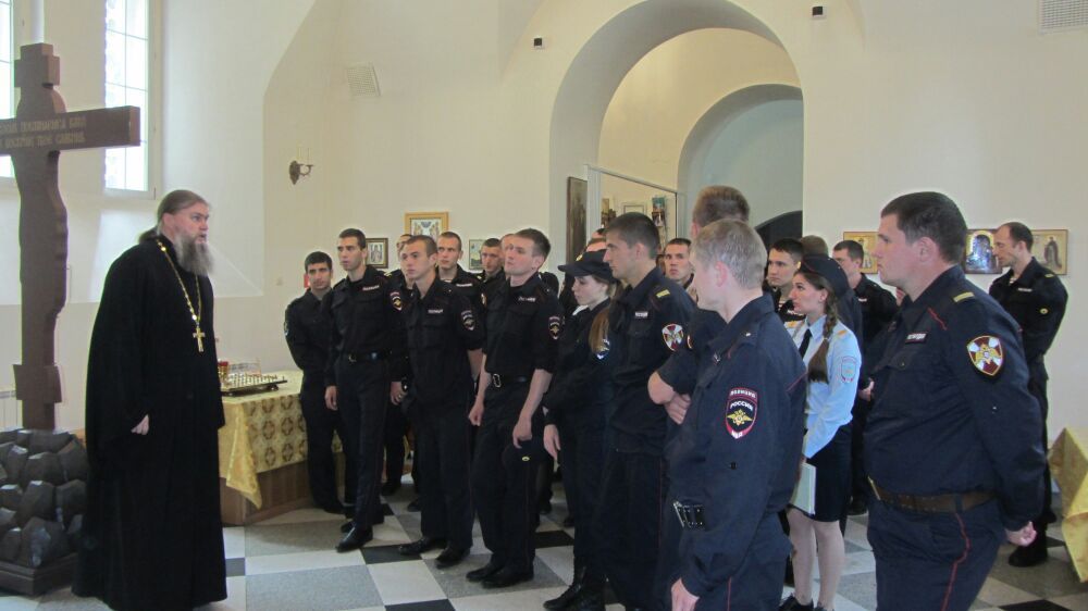 Основное внимание будущих полицейских было сосредоточенно на важности ответственного служения своей стране и деятельной любви к соотечественникам. Добрым примером в этом деле служат святые воины, мужественные лики которых были обозреваемы присутствующими. Беседу и экскурсию провел настоятель храма протоиерей Александр Бачурин.
