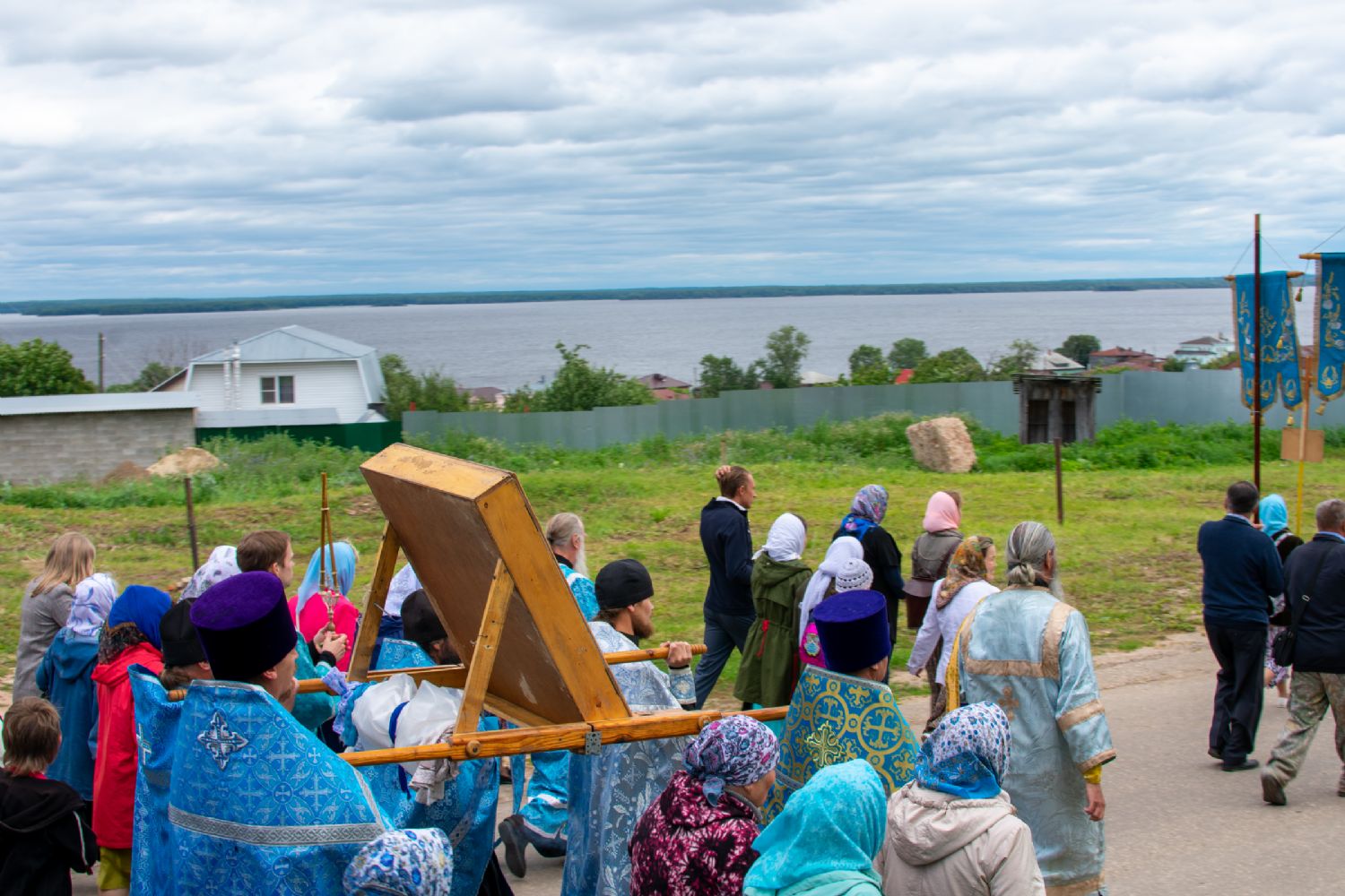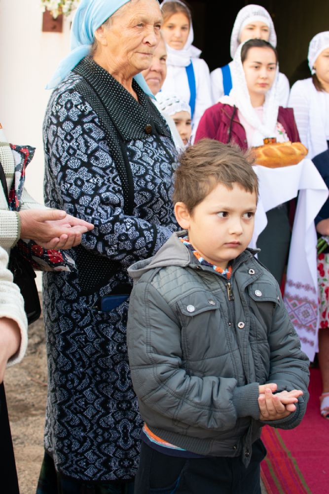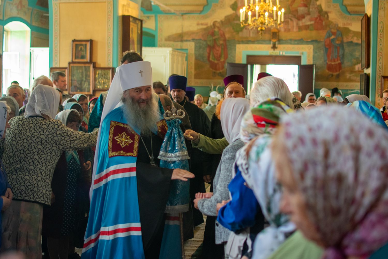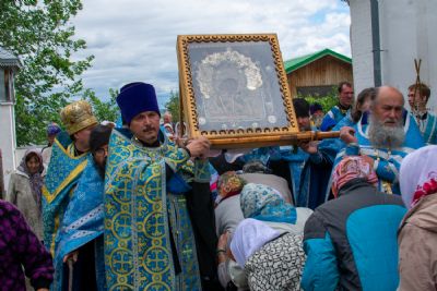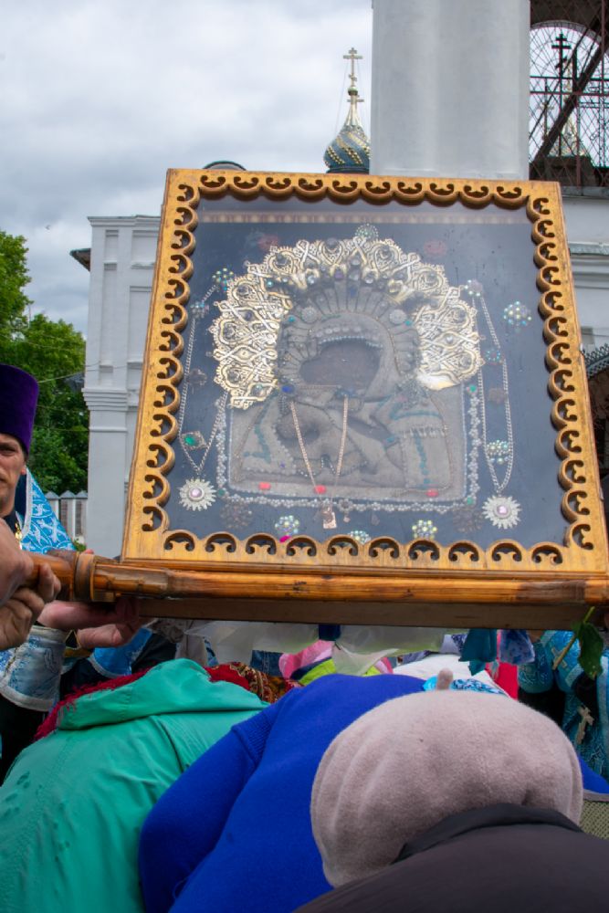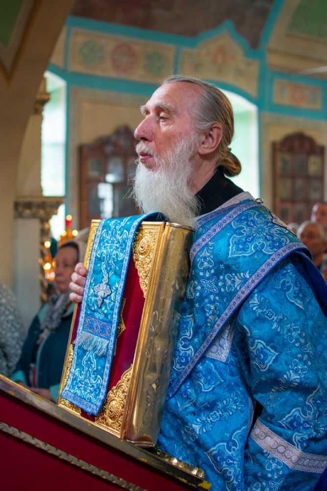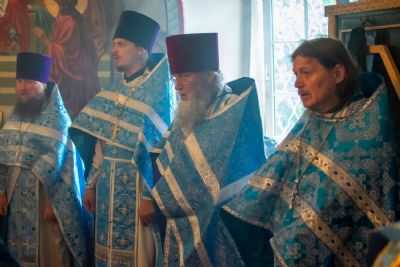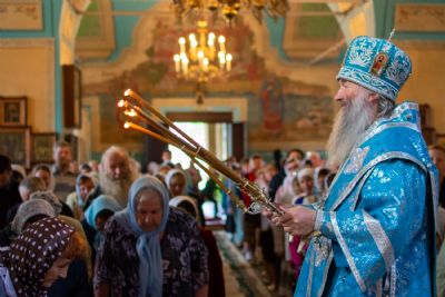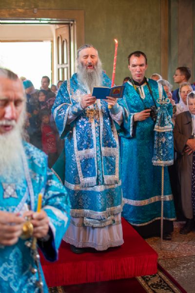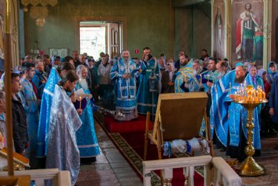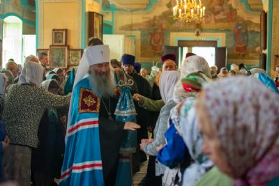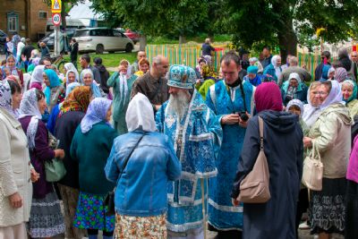 Затем была предложена трапеза, после которой Владыка возглавил крестный ход с Владимирской иконой Пресвятой Богородицы до Смоленского собора. В соборе перед иконой Пресвятой Богородицы пропели акафист и крестный ход с иконой, обойдя храм, направился в с. Владимирское.