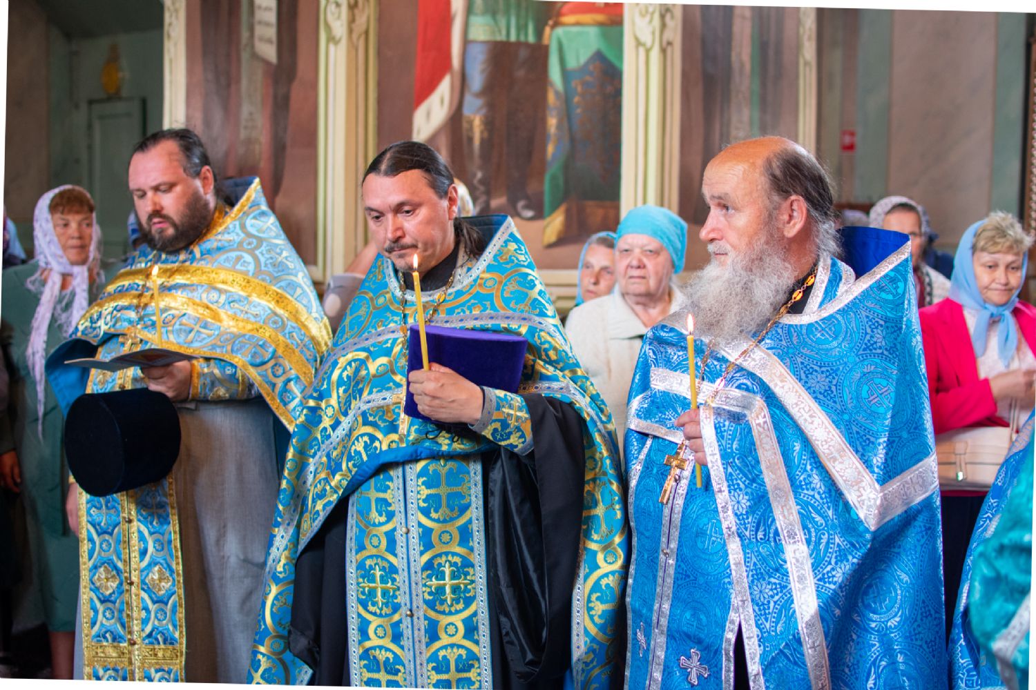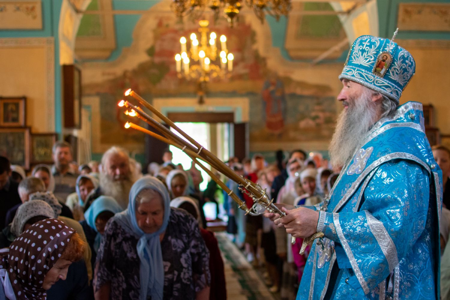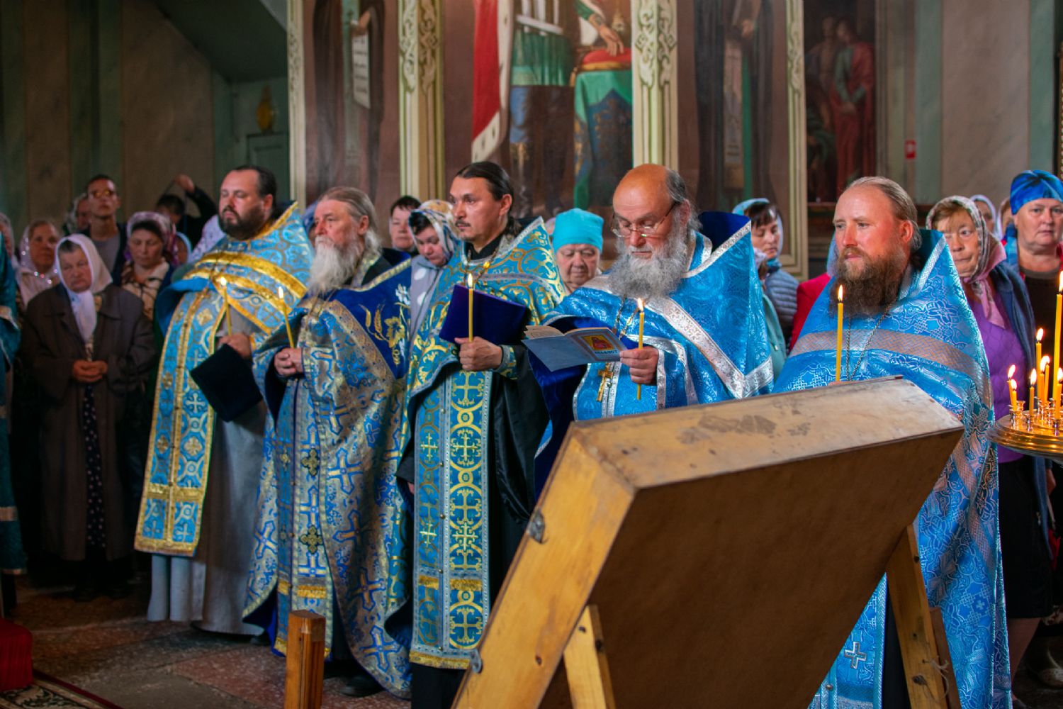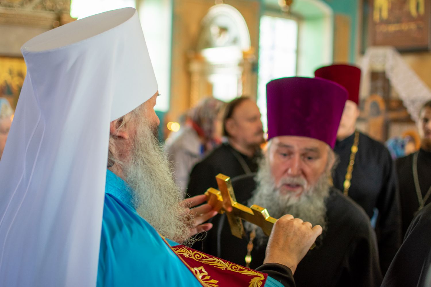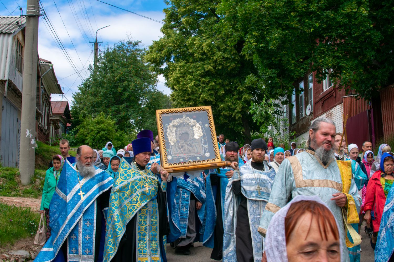 Затем была предложена трапеза, после которой Владыка возглавил крестный ход с Владимирской иконой Пресвятой Богородицы до Смоленского собора. В соборе перед иконой Пресвятой Богородицы пропели акафист и крестный ход с иконой, обойдя храм, направился в с. Владимирское.