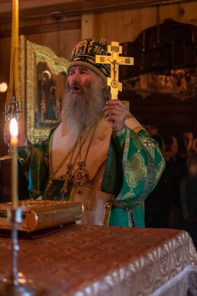 Богослужение началось торжественной встречей Владыки и облачением в центре храма. За богослужением читались отрывки из послания апостола Павла к Галатам о плодах Духа и из Евангелия от Матфея нагорная проповедь и заповеди блаженства.