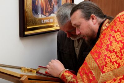Его Преосвященству сослужил секретарь Волжского епархиального управления протоиерей Александр Михайлов, клирик храма святого праведного Иоанна Кронштадтского иерей Матфей Сапаев, клирик Никольского кафедрального собора диакон Иоанн Захаров.