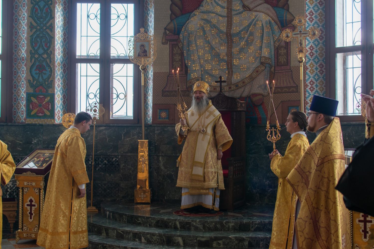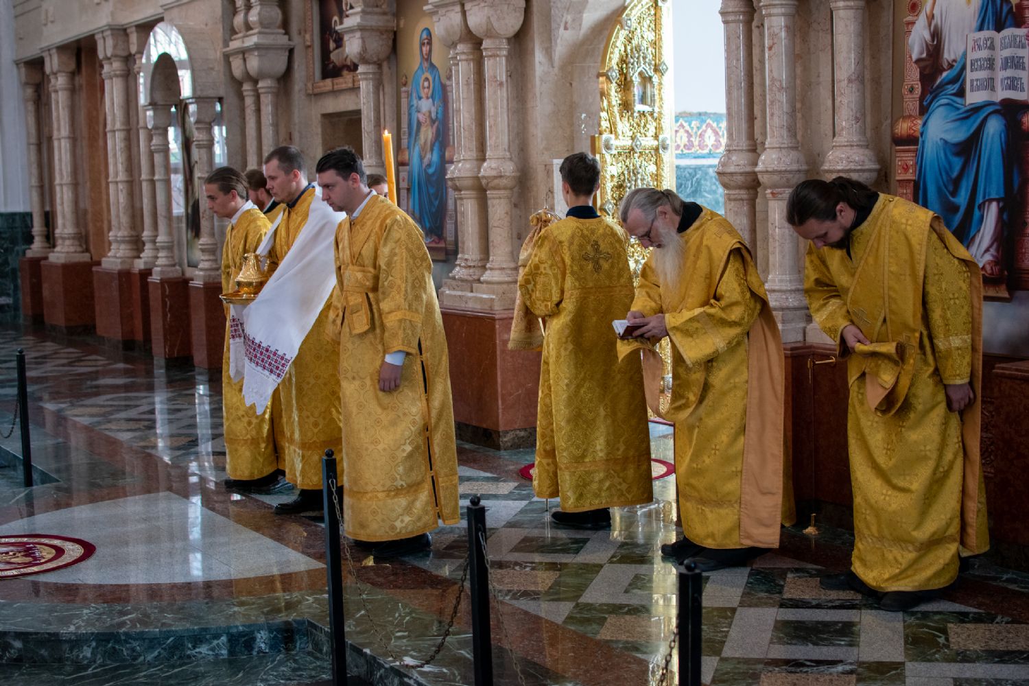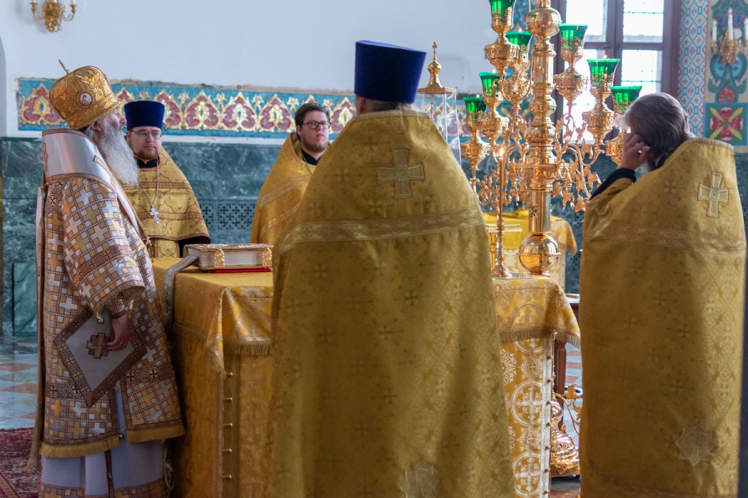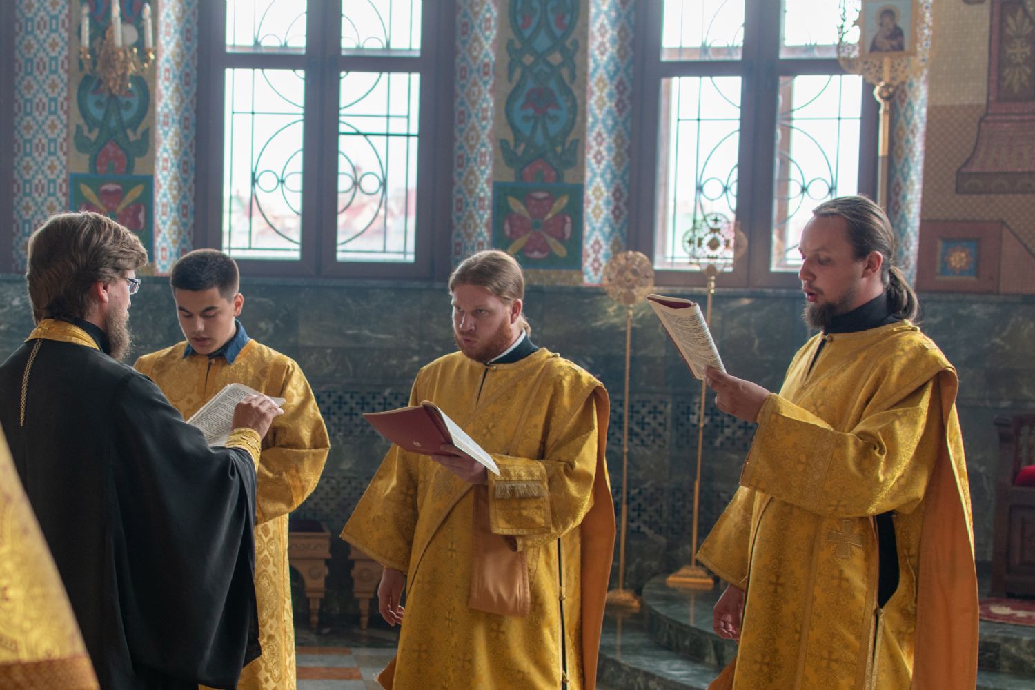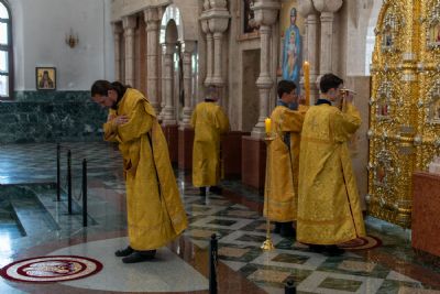 Владыке сослужили ключарь собора протоиерей Серий Поглазов, клирики собора иереи Артемий Промович, Евгений Самойлов, диаконы Андрей Дружинин, Игорь Коваль и клирик храма Рождества Пресвятой Богородицы с. Семеновка протодиакон Михаил Козловский.