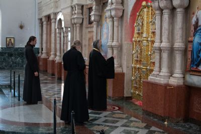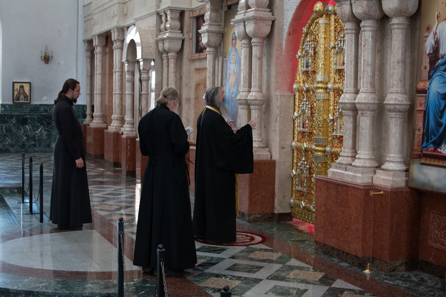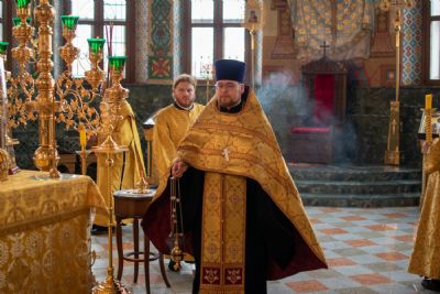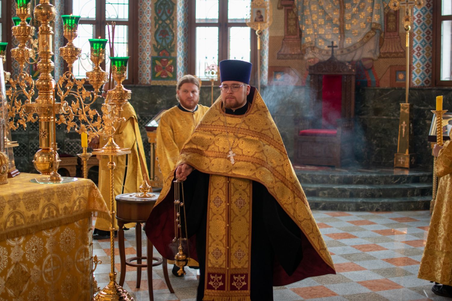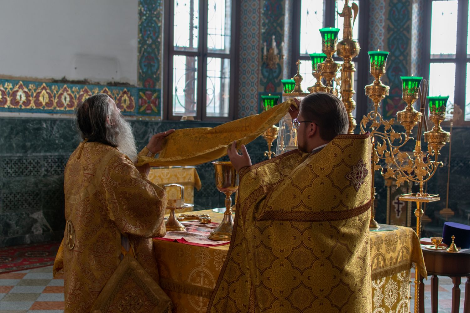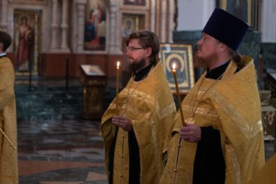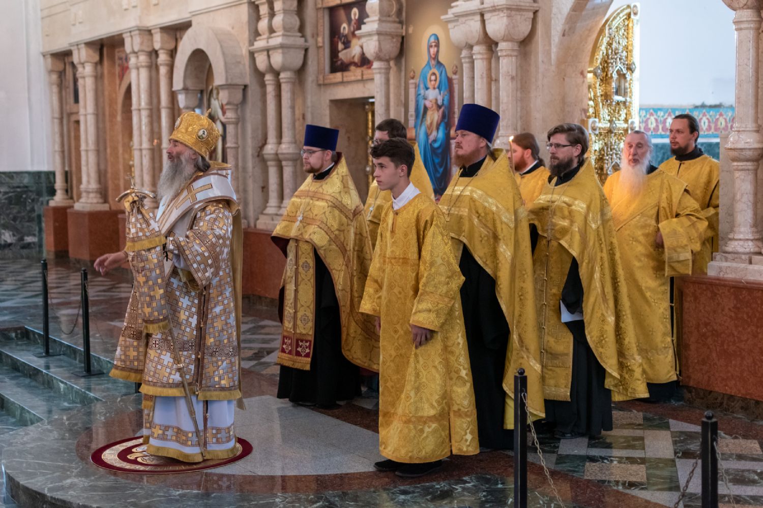 Владыке сослужили ключарь собора протоиерей Серий Поглазов, клирики собора иереи Артемий Промович, Евгений Самойлов, диаконы Андрей Дружинин, Игорь Коваль и клирик храма Рождества Пресвятой Богородицы с. Семеновка протодиакон Михаил Козловский.