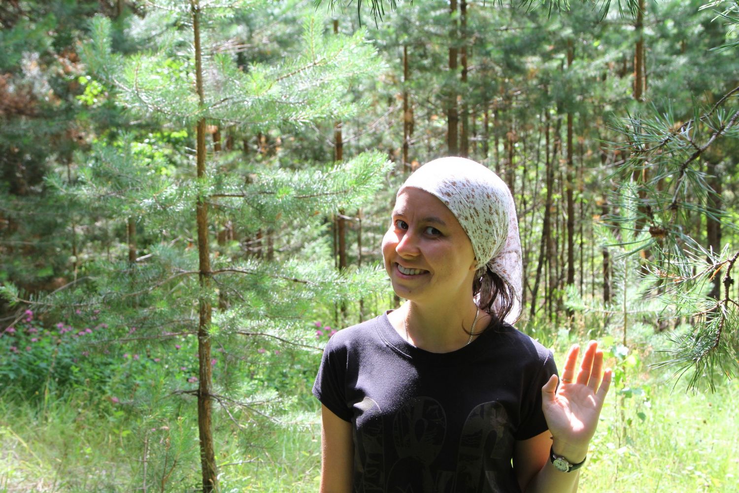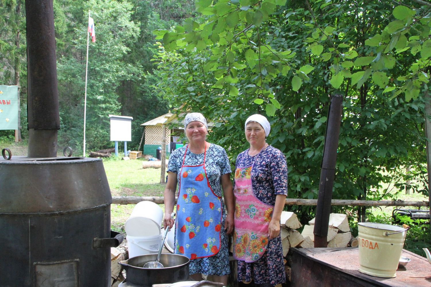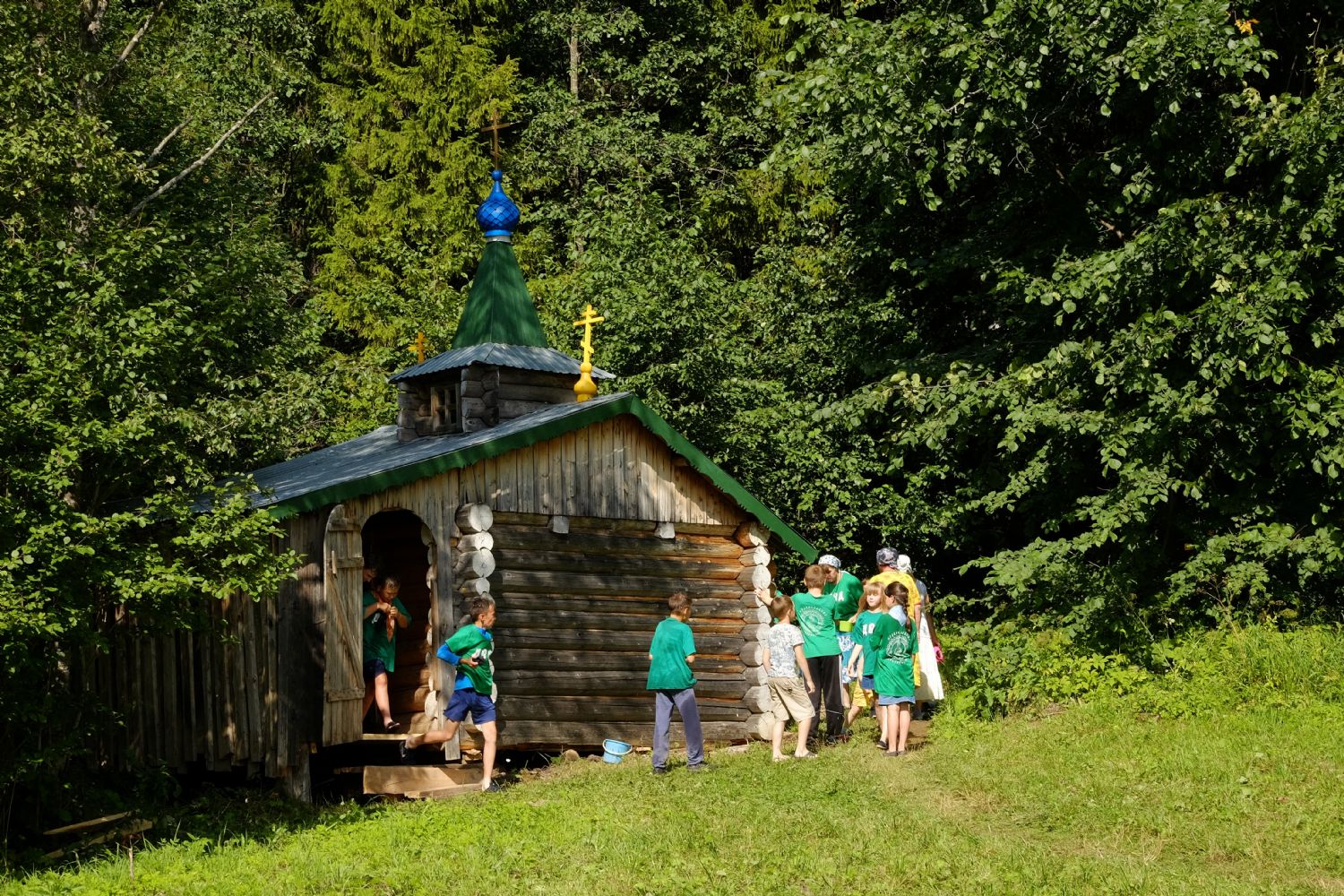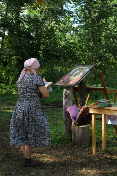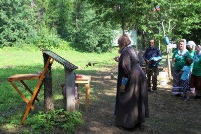 Место для лагеря выбрано прекрасное. Находится он у подножия склона, густо поросшего сосновым лесом. Именно здесь в свое время появилась одна из первых на приходе часовен с купальней над источником, освященным в честь равноапостольного князя Владимира.