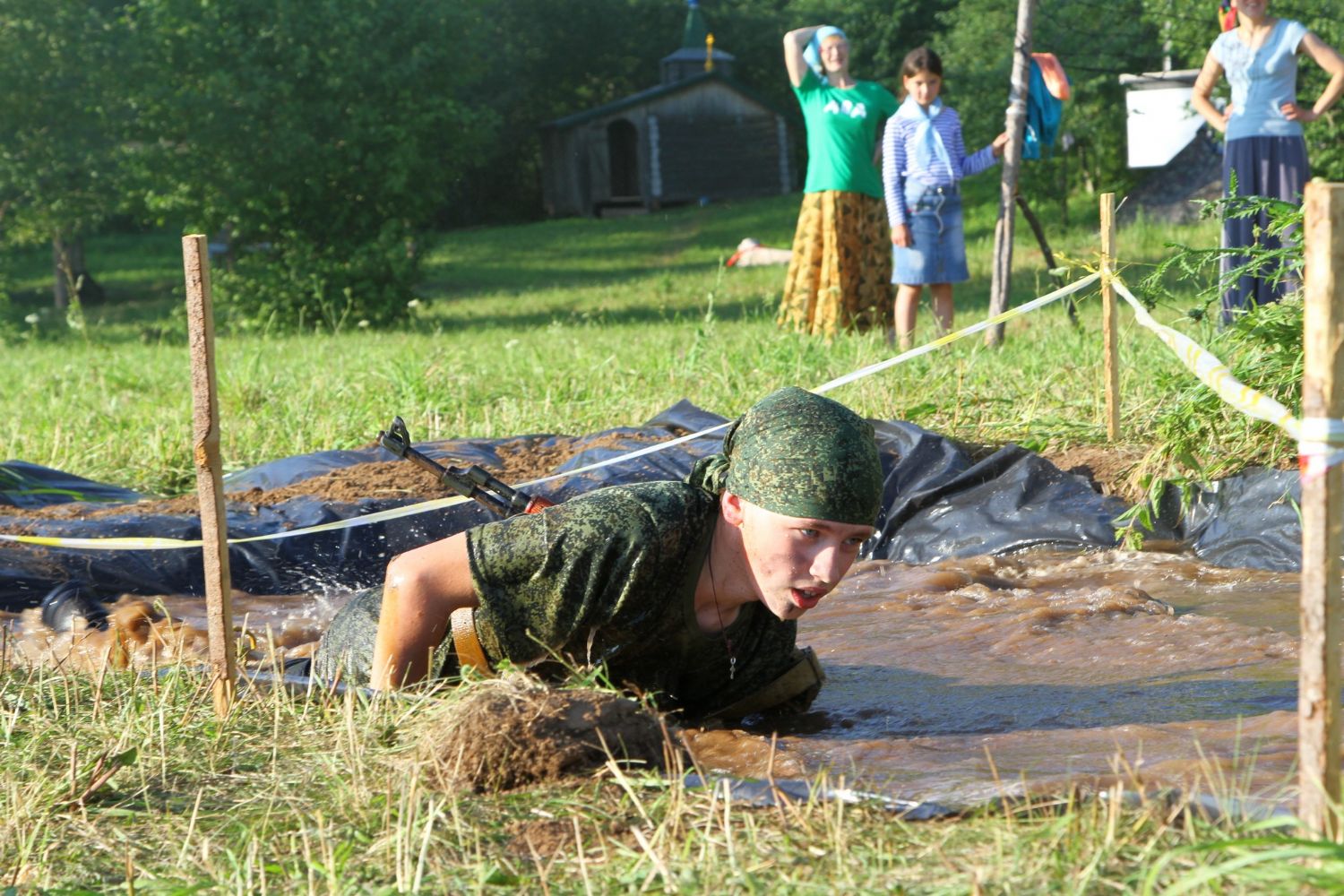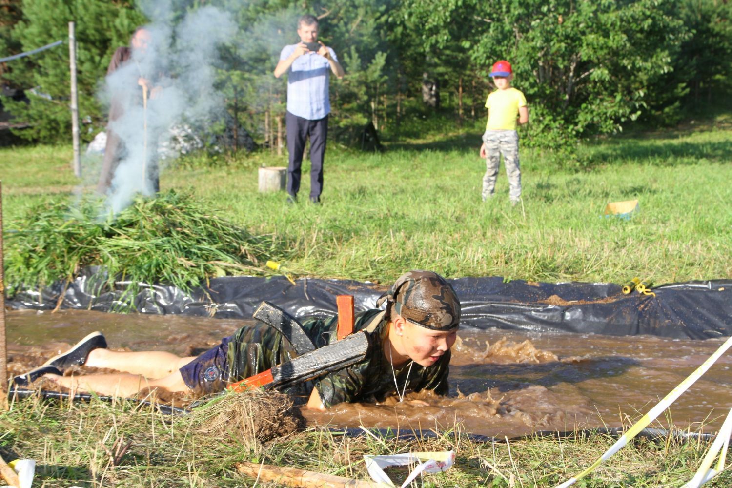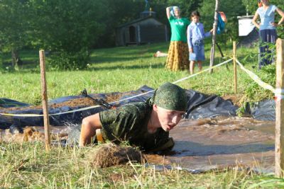 Оно из самых долгожданных событий лагерной смены — преодоление полосы препятствий, где участников команд ждет метание гранат, стрельба по мишеням из «воздушки», барьеры и ров с водой. С каким рвением дети состязаются, борьба идет не «детская». Команды поддерживают своих участников такими громкими криками, что, не смотря на отдаленность от деревни, жители ее, наверняка, слышать дружное «Саша, быстрей!»