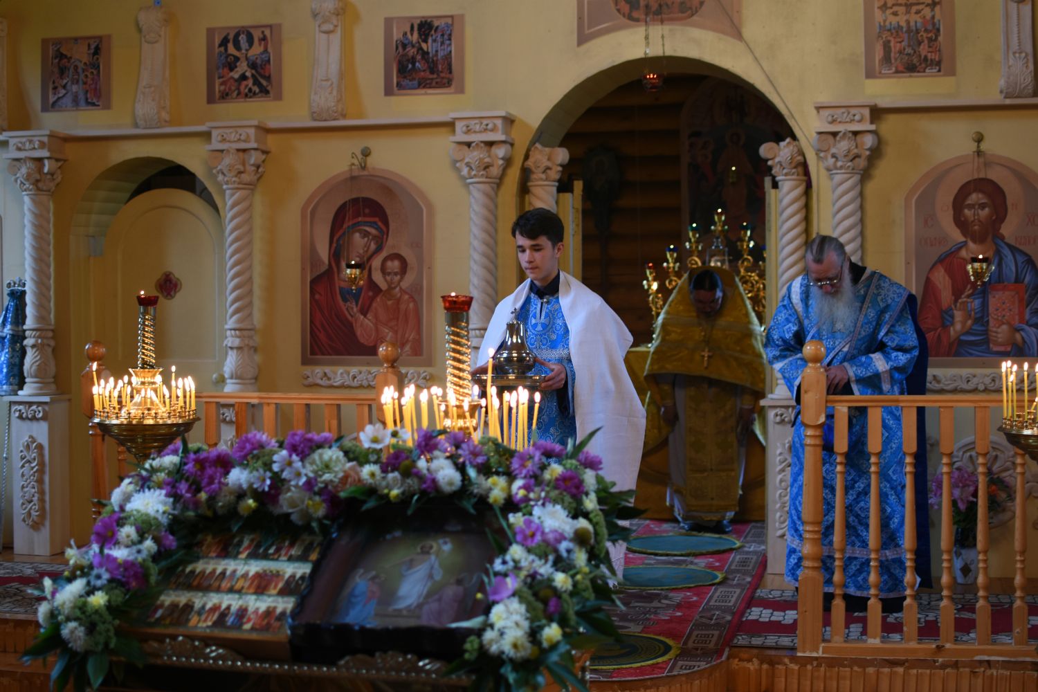 Владыке сослужили настоятель храма протоиерей Александр Лукьянов, клирик Благовещенского Кафедрального собора иерей Никифор Захаров и клирик храма Рождества Пресвятой Богородицы с. Семеновка протодиакон Михаил Козловский. Песнопения исполнял хор под руководством регента Ангелины Соловьевой. Богослужение началось торжественной встречей митрополита Иоанна и облачением в центре храма.
