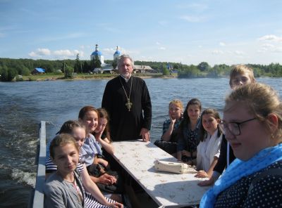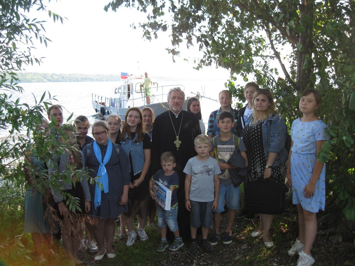 После молебна о путешествующих паломники переправились на катере на другой берег Волги, где стоит красивый бело-голубой храм, похожий на корабль. В церкви батюшка рассказал детям о ее устройстве, обратив их внимание на иконостас и настенную роспись, а также поделился своими воспоминаниями о детстве, проведенном в стенах этого храма. Затем все поспешили к настоятелю храма архимандриту Иоанну Барсукову получить благословение.