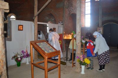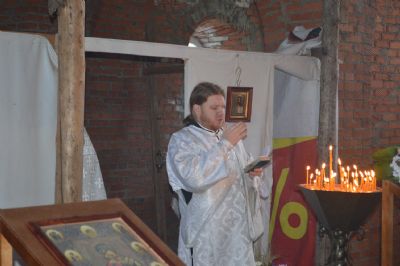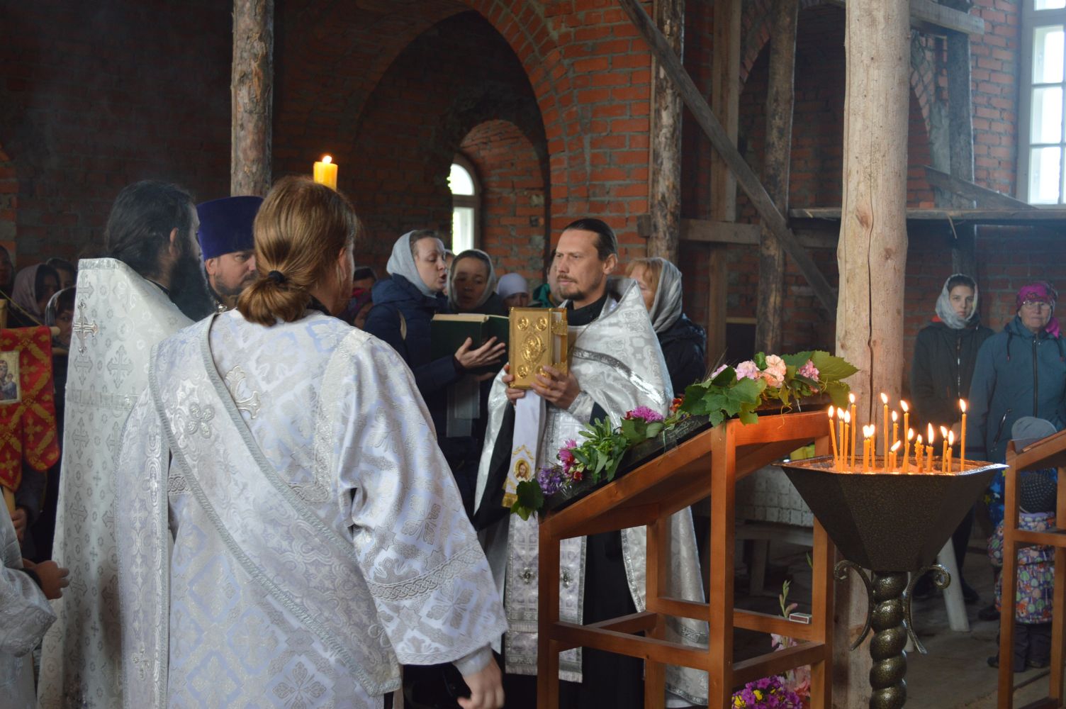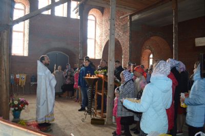 Богослужение проходило внутри строящегося храма. Сослужили за Литургией: клирик Воскресенского собора г. Йошкар-Олы иерей Андрей Кочаков и клирик кафедрального собора Благовещения Пресвятой Богородицы г. Йошкар-Олы диакон Андрей Дружинин.