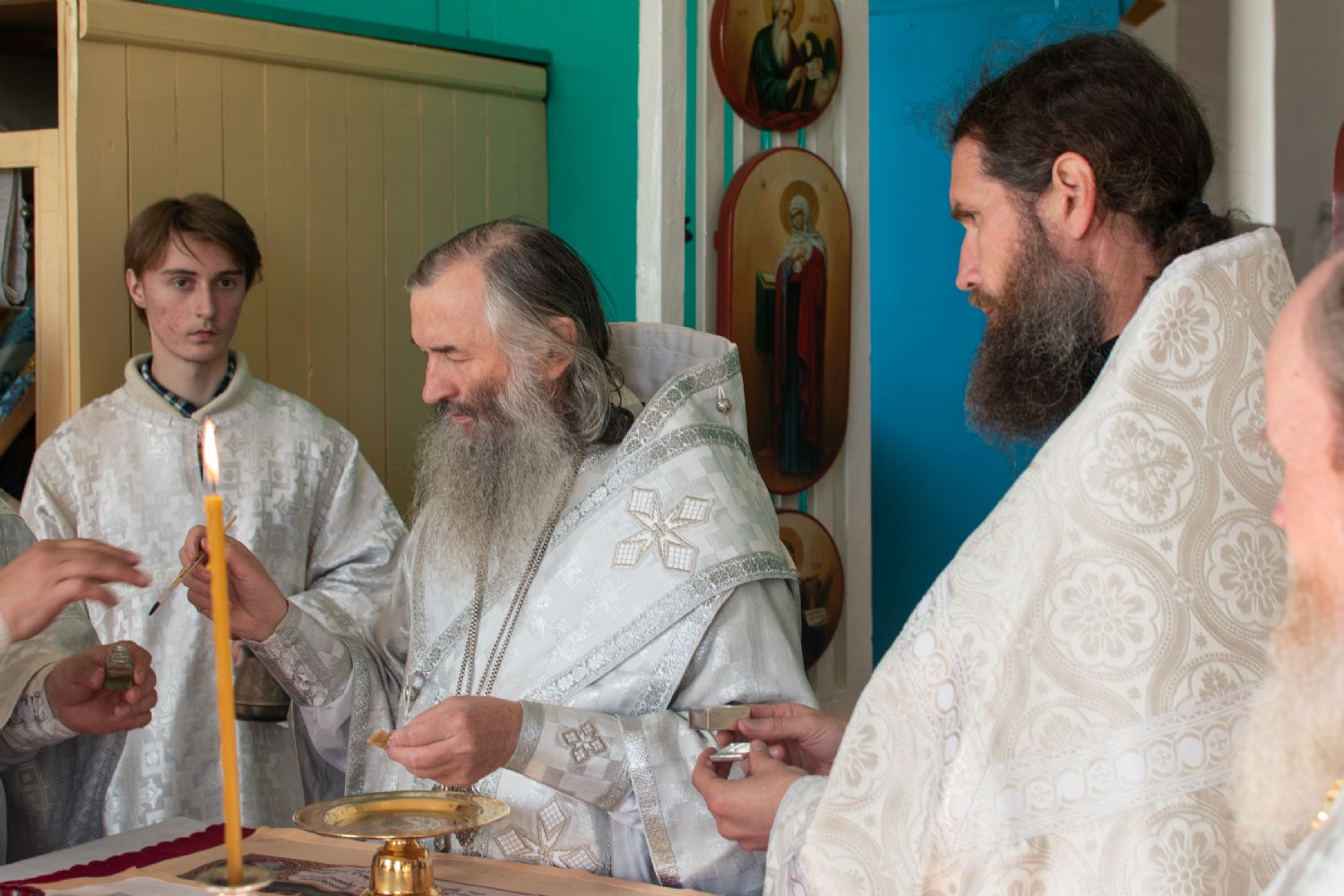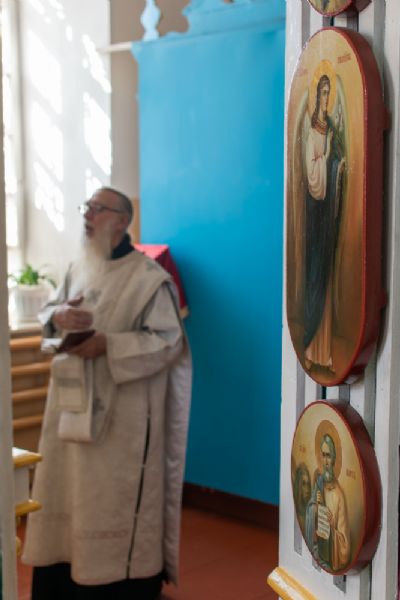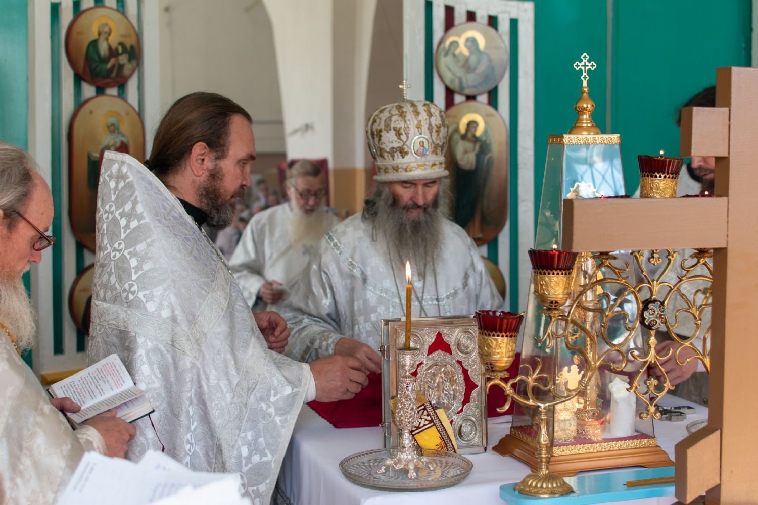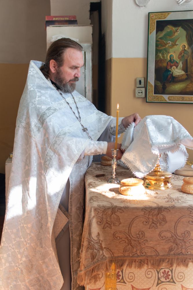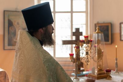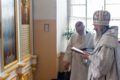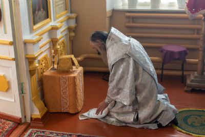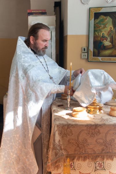 Затем Владыка объяснил особенности службы – ранний водосвятный молебен, торжественное внесение мощей в храм, закрытие врат алтаря при освящении, освящение престола.
