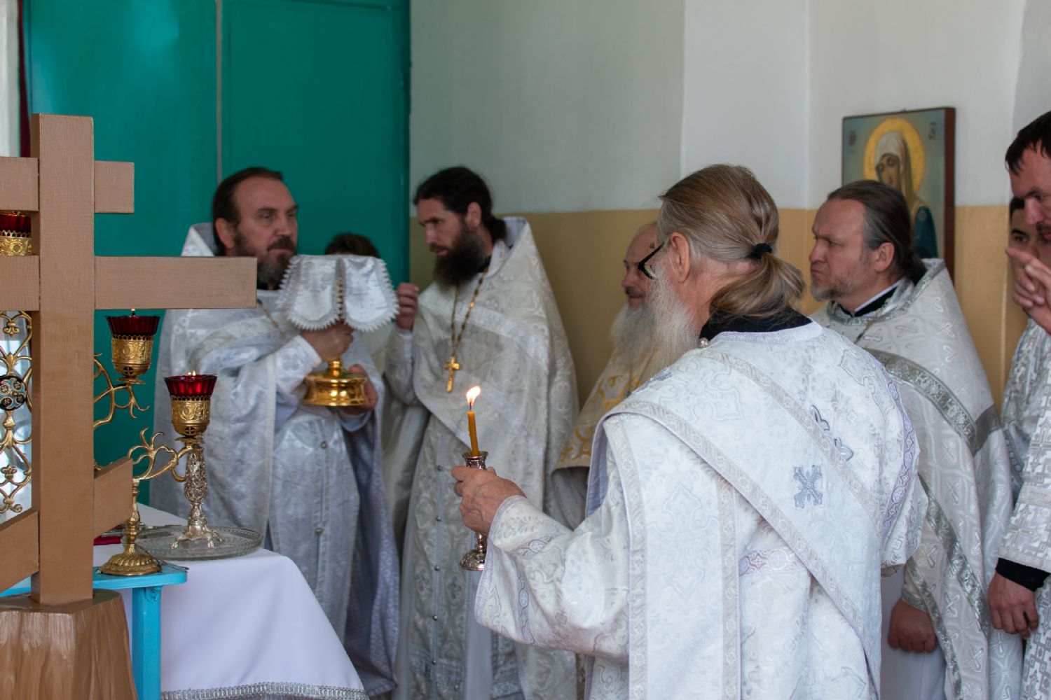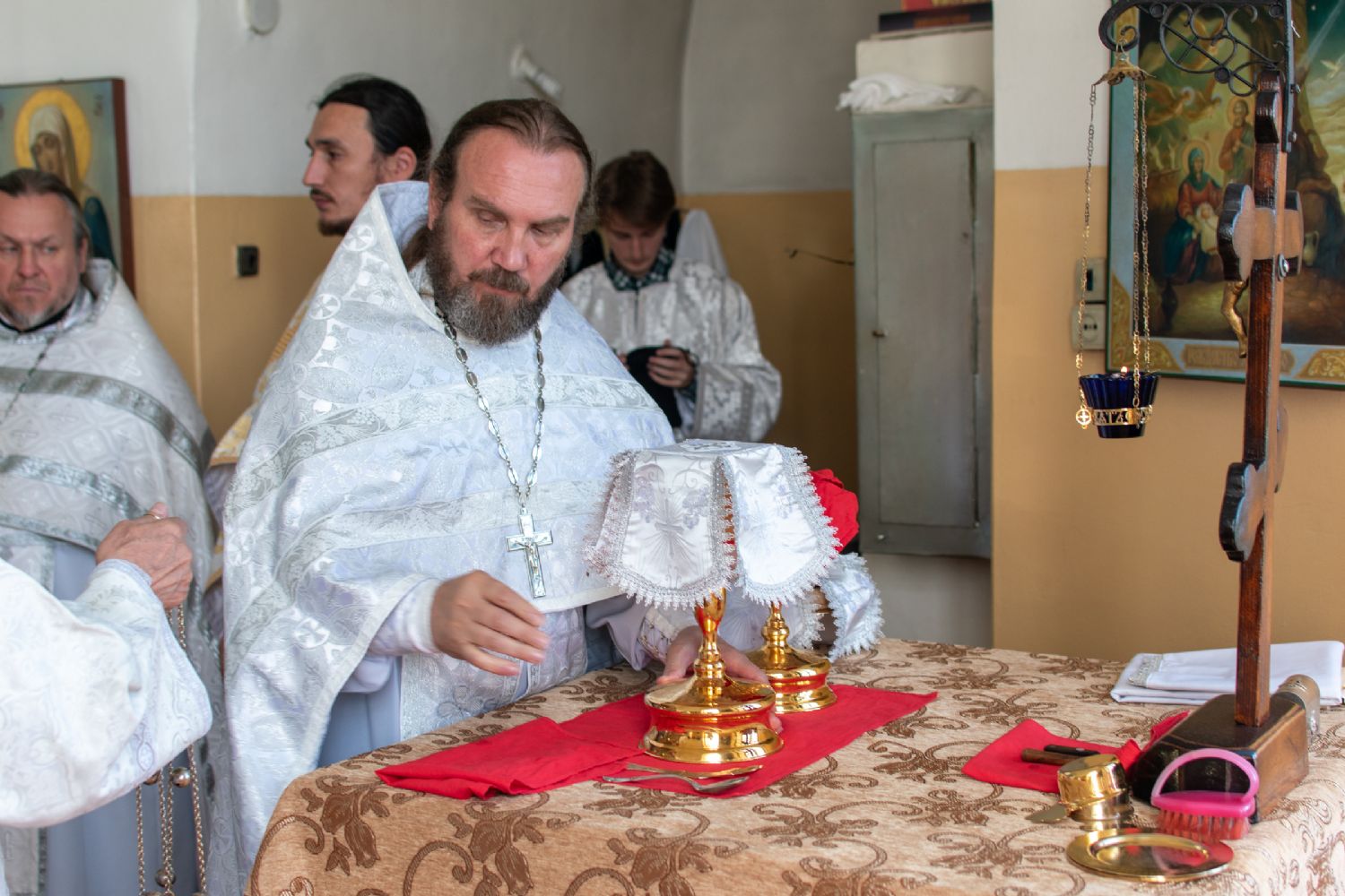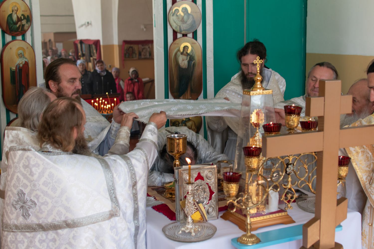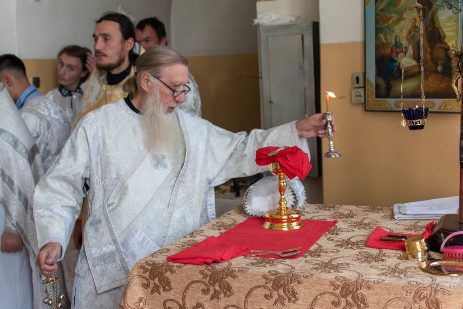 Затем Владыка объяснил особенности службы – ранний водосвятный молебен, торжественное внесение мощей в храм, закрытие врат алтаря при освящении, освящение престола.