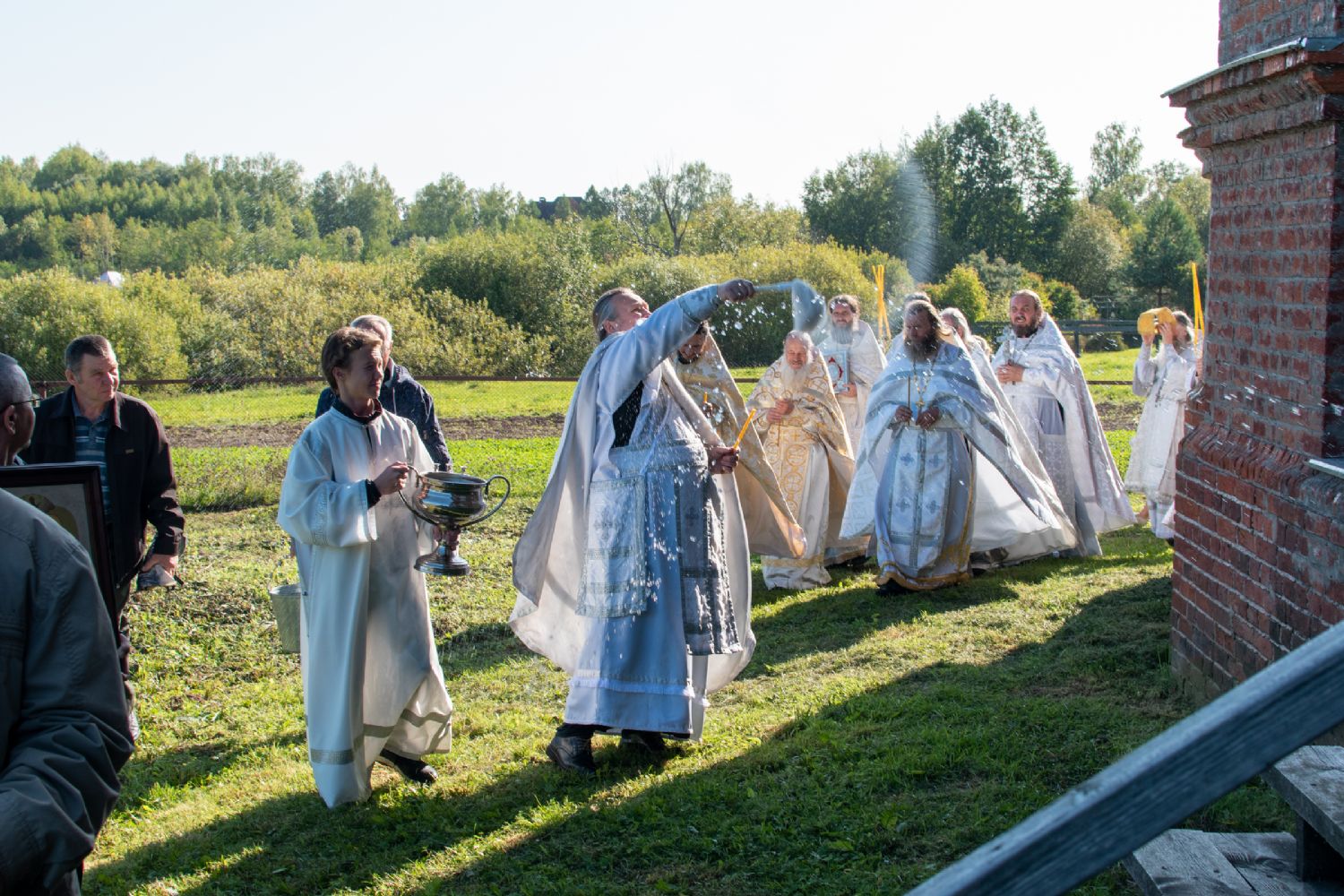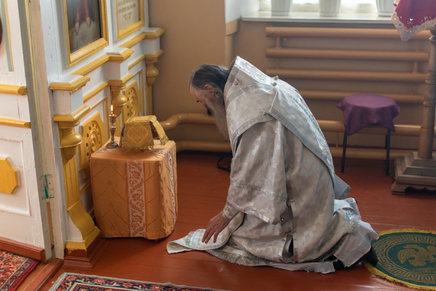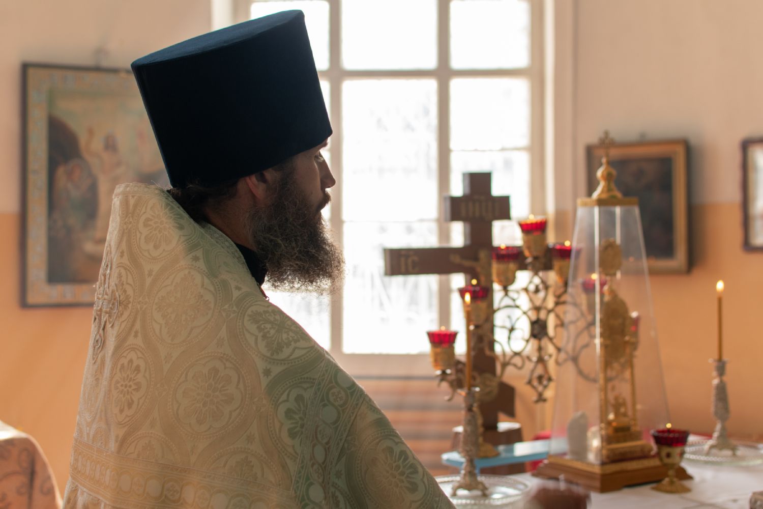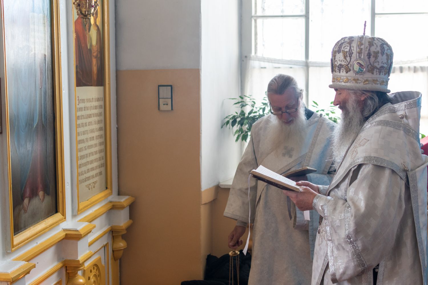 Затем Владыка объяснил особенности службы – ранний водосвятный молебен, торжественное внесение мощей в храм, закрытие врат алтаря при освящении, освящение престола.