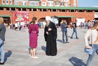 Владыка также поприветствовал молодых горожан: «Дорогие братья и сестры! Уважаемая молодежь! Святая держава Российская на протяжении всей своей истории стремилась к тому, чтобы семья наша и детки были опорой нашего государства, ее созидателями. А как можно созидать, когда в семью и сердце человека проникают те страшные дьявольские искушения, которые увлекают человека уже здесь, на земле, в бездну хаоса и беспорядка? Алкоголизм, наркомания, иные страшные пороки все больше и больше молодеют, поглощают тех, на которых на должны опираться, взирая, что они примут от нас не только бразды правления, но и будут созидателями нашей державы. Но для того, чтобы изничтожить этот страшный порок из сердец человеческих, необходимо, чтобы каждый из нас стремился к тому, чтобы сердце его имело духовно-нравственную опору, чтобы ум человеческий всегда имел трезвое рассуждение и стремление к тому, чтобы творить и созидать. Пусть Господь милостью Своею искоренит из нашего сердца то страшное, безумное, которое поглощает плоть. Пусть милость Царицы Небесной пребывает со всеми нами».