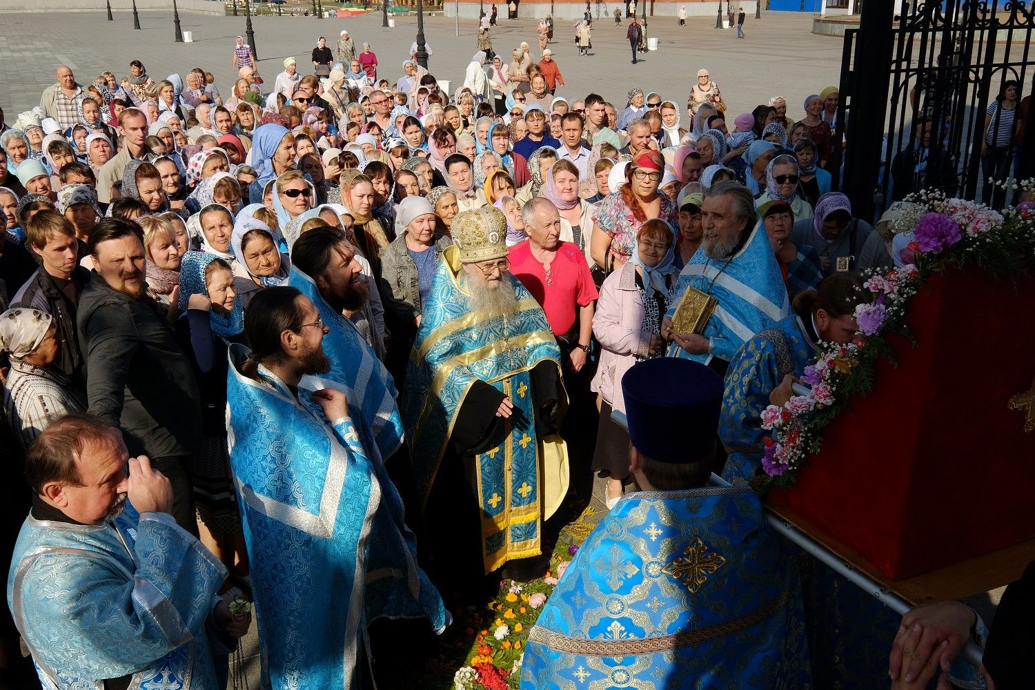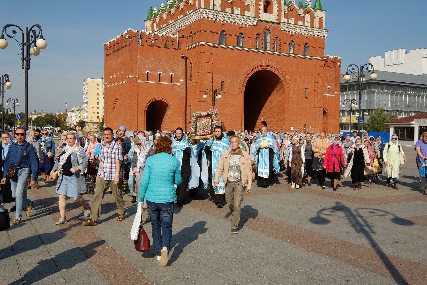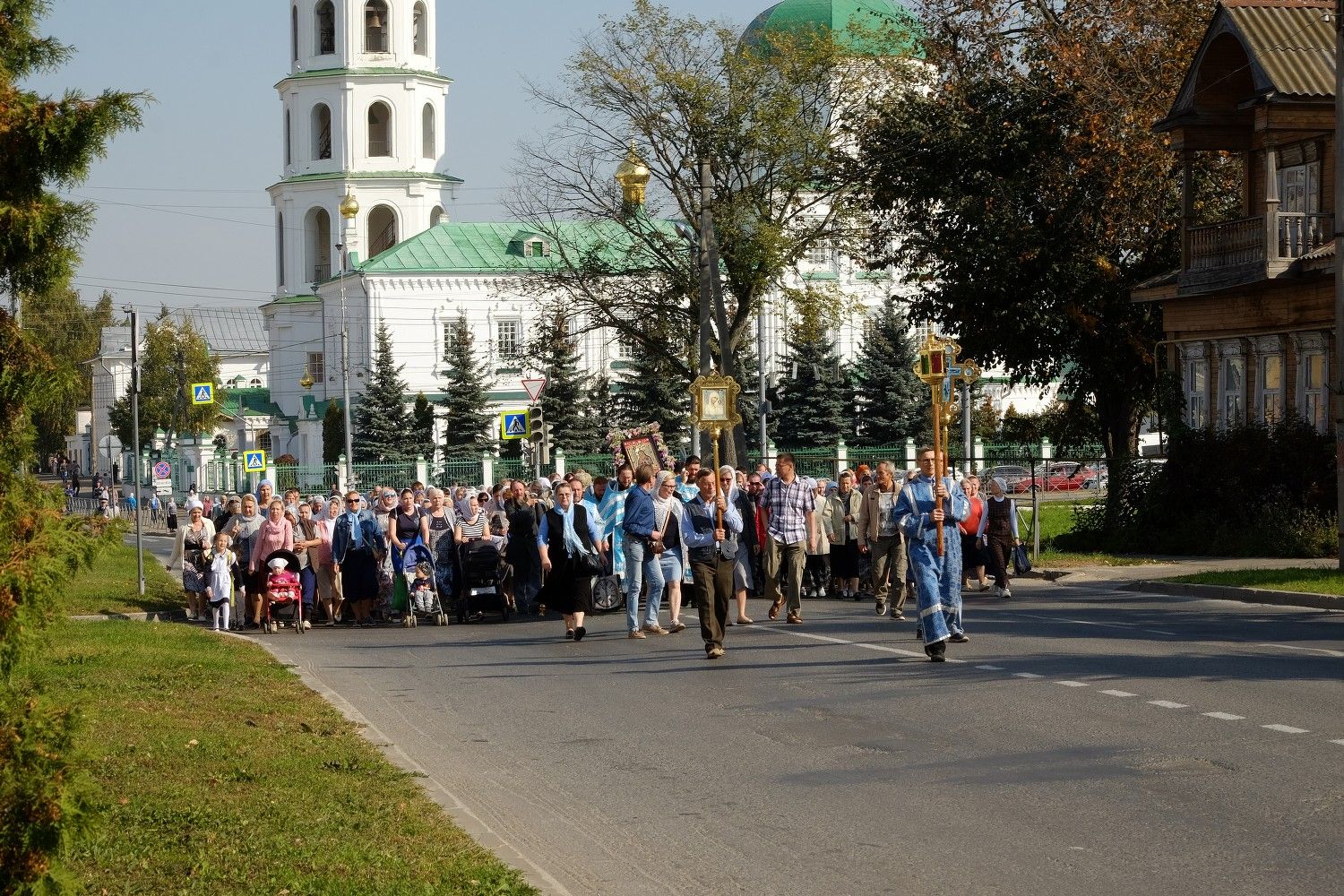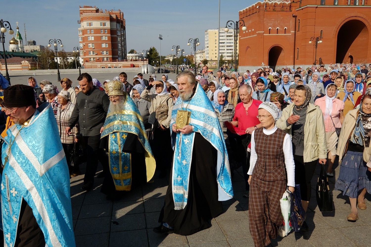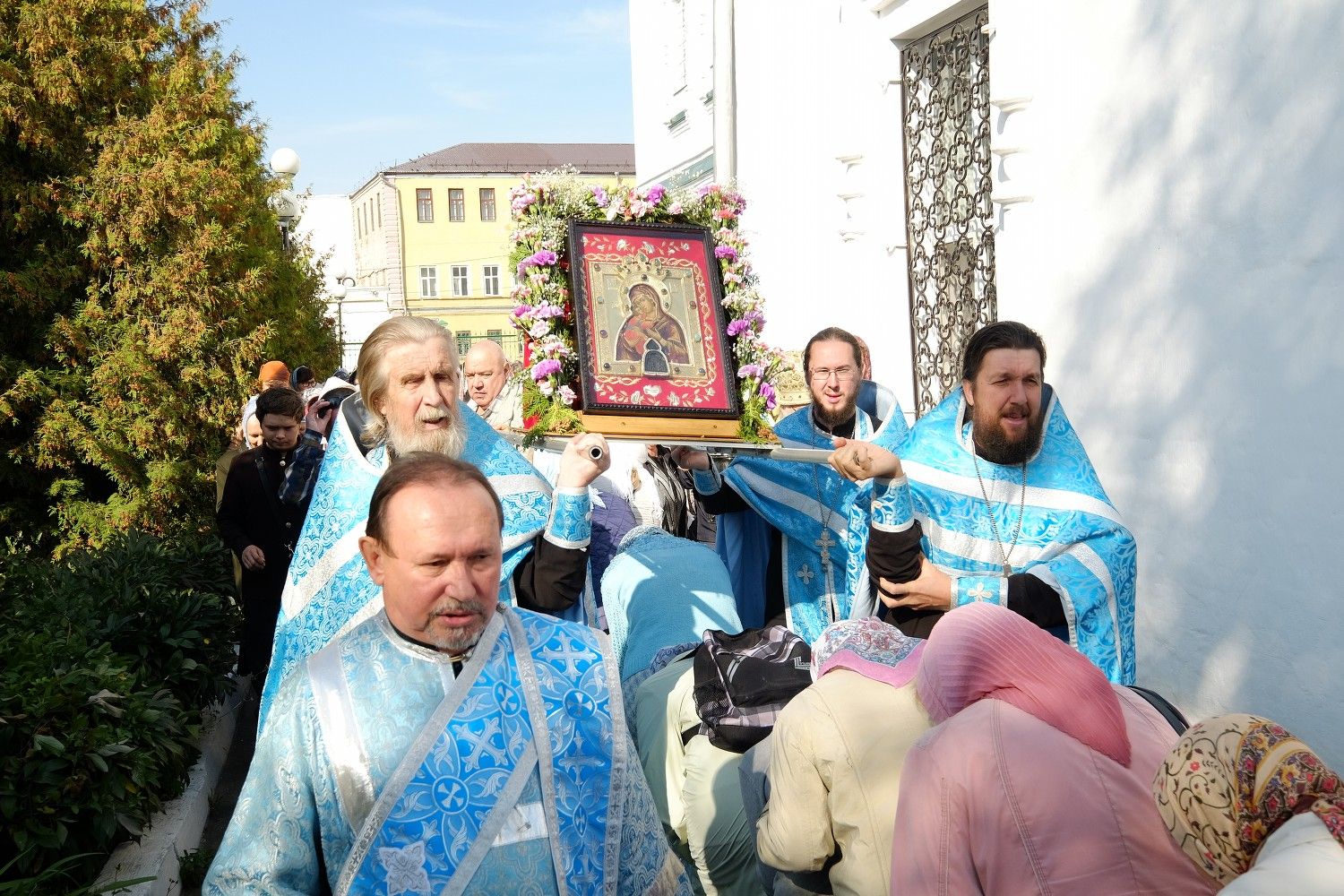 После Божественной литургии в Вознесенском соборе, настоятель собора протоиерей Евгений Кутырев, клирики собора и миряне прошли крестным ходом под Покровом Царицы Небесной по улице Вознесенской до кафедрального собора.