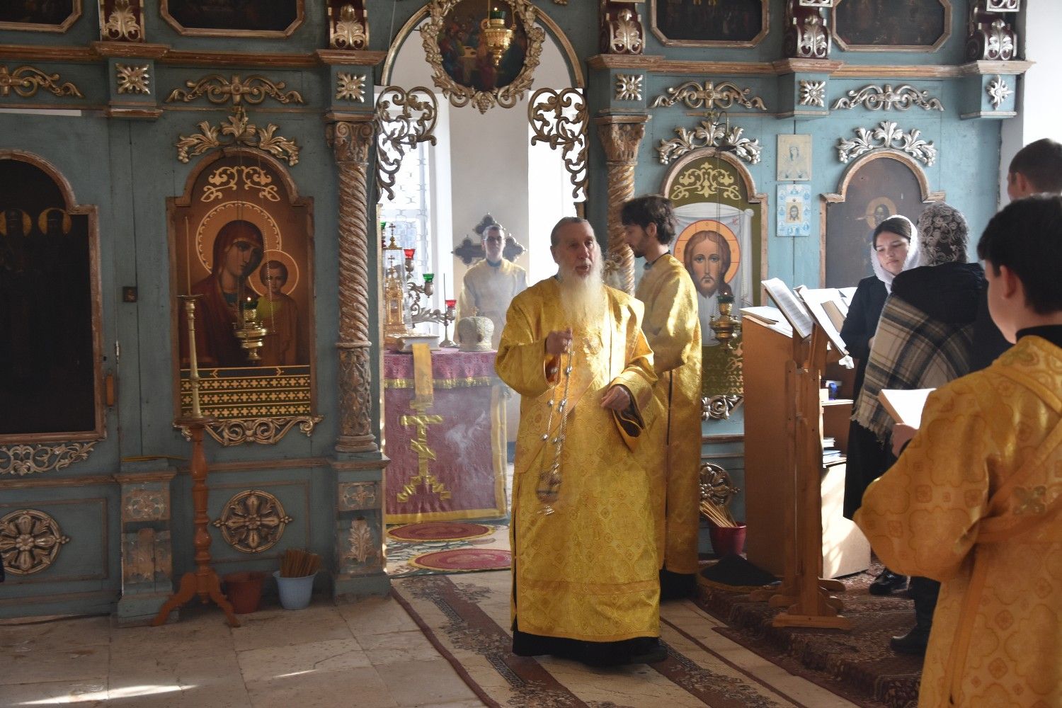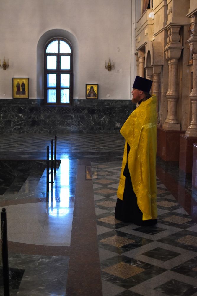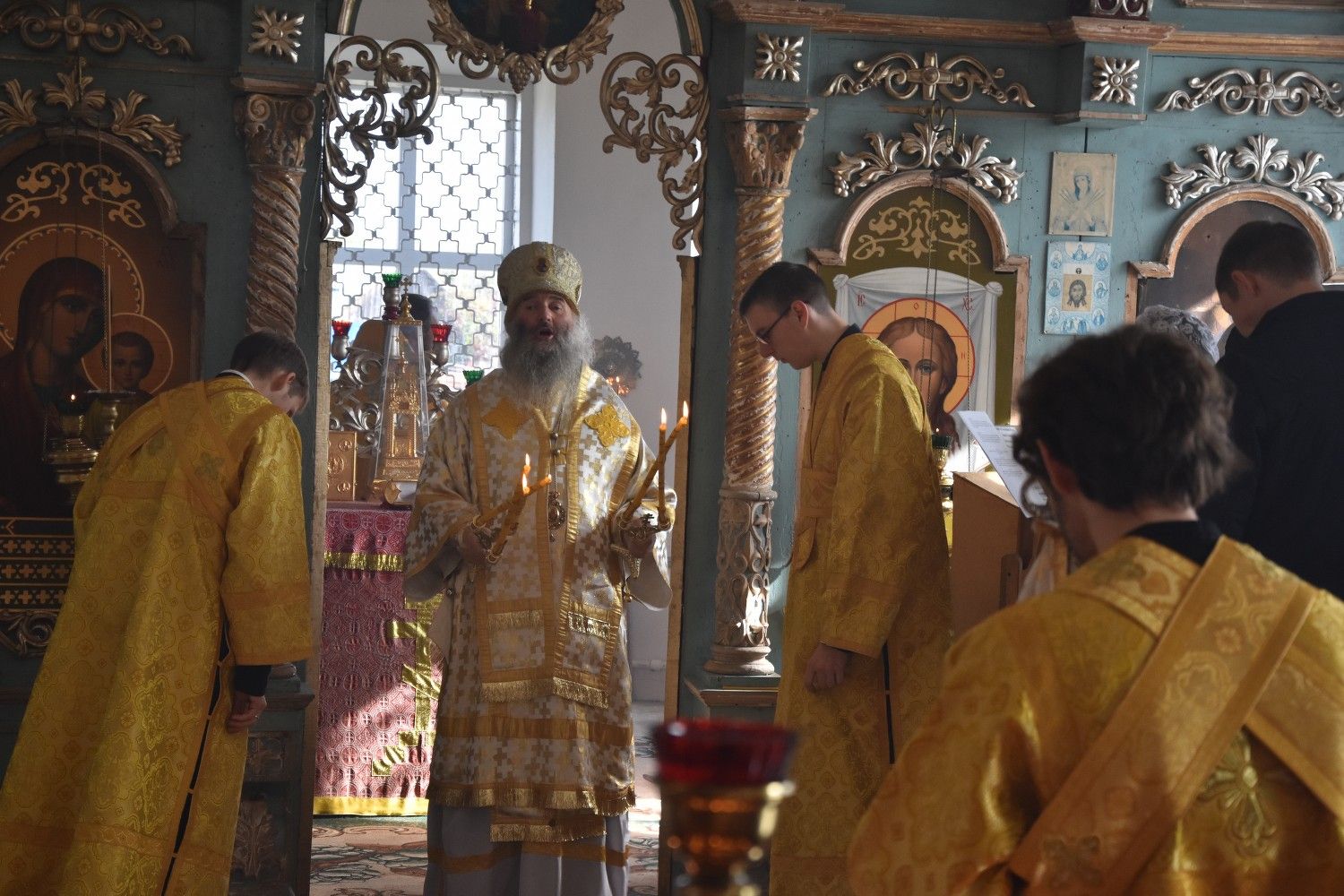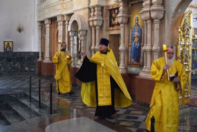 Владыке сослужили: ключарь собора протоиерей Сергий Поглазов, клирики собора иереи Евгений Самойлов, Артемий Промович, Никифор Захаров, диакон Игорь Коваль и клирик храма Рождества Пресвятой Богородицы села Семеновка протодиакон Михаил Козловский.