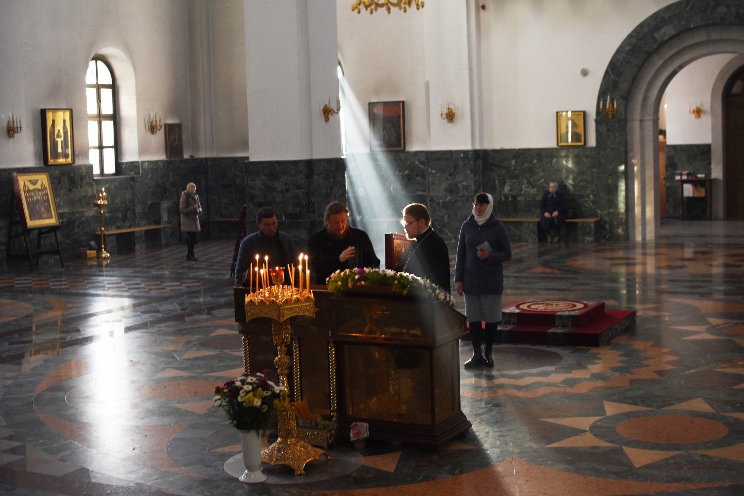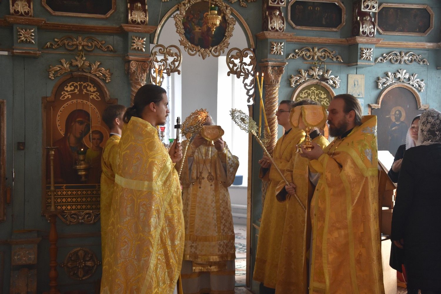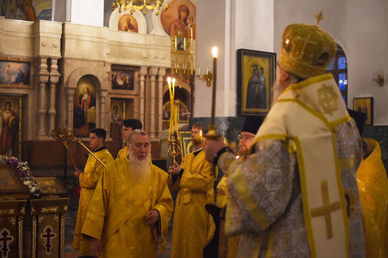 Владыке сослужили: ключарь собора протоиерей Сергий Поглазов, клирики собора иереи Евгений Самойлов, Артемий Промович, Никифор Захаров, диакон Игорь Коваль и клирик храма Рождества Пресвятой Богородицы села Семеновка протодиакон Михаил Козловский.