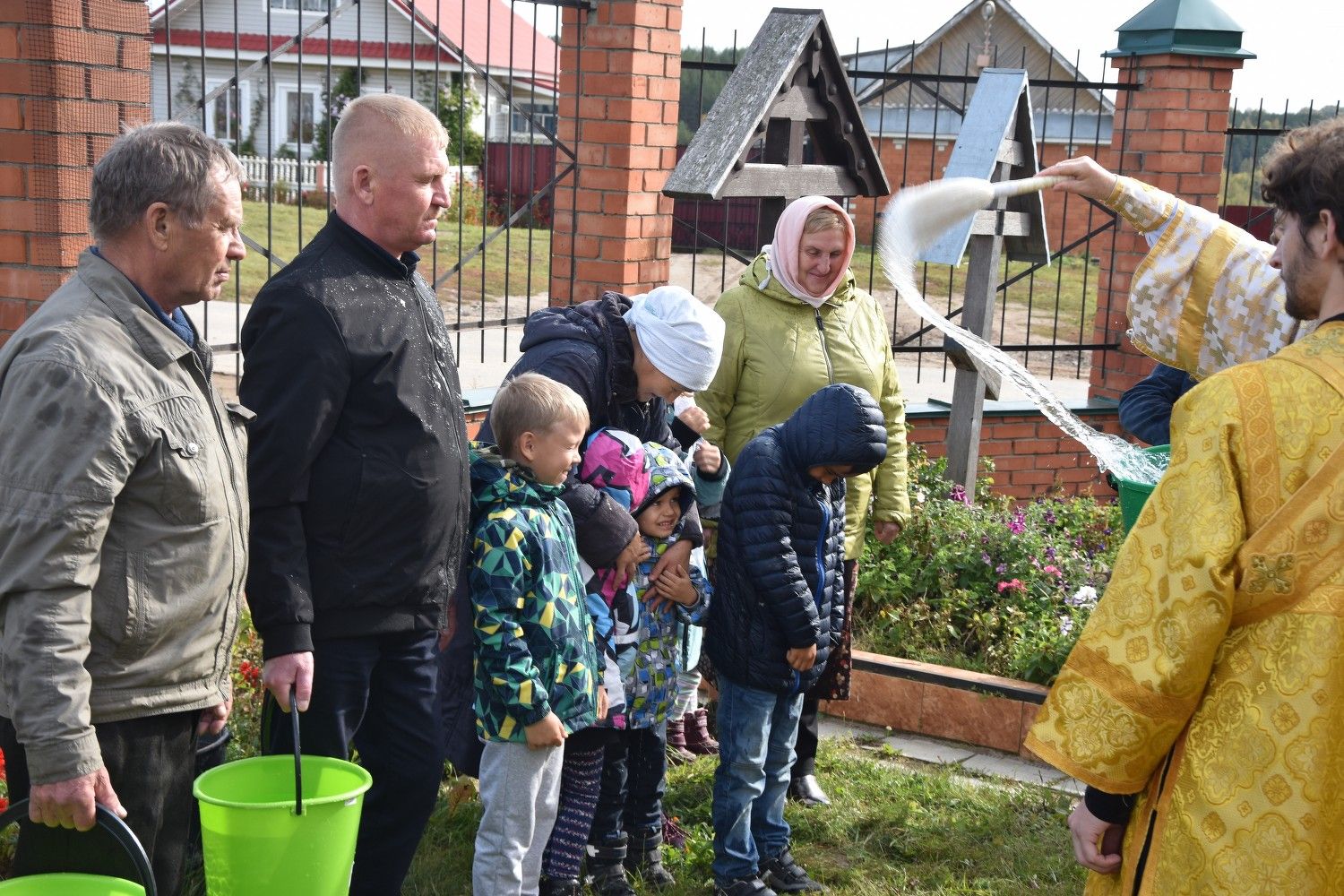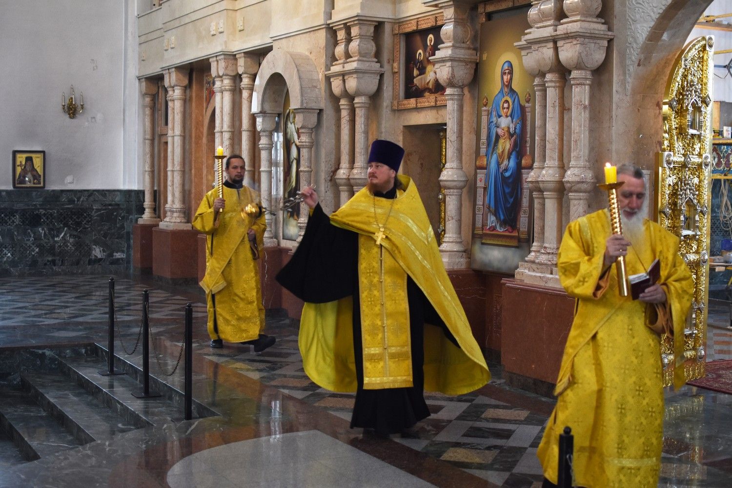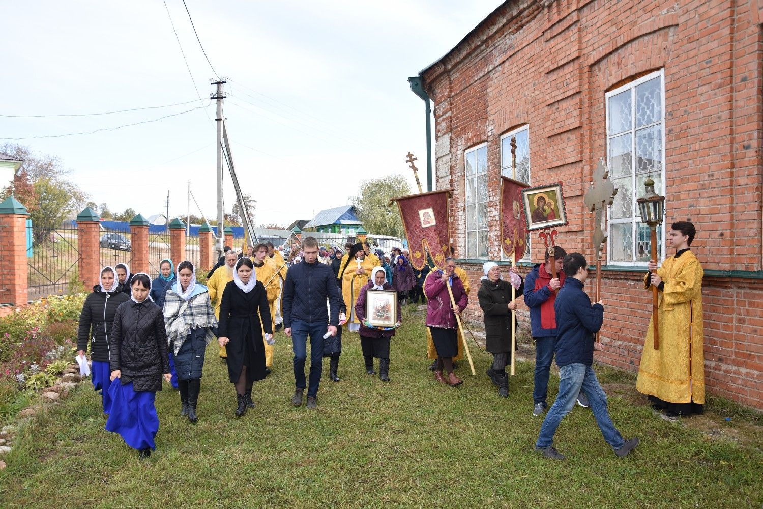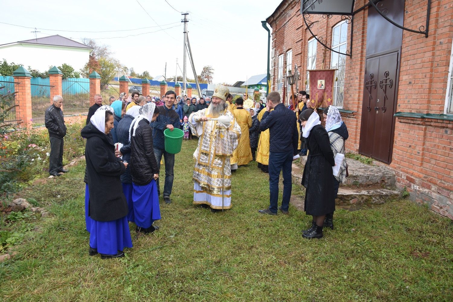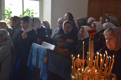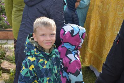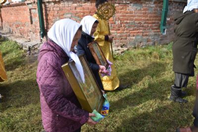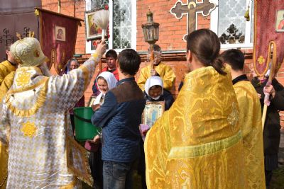 После литургии прошел крестный ход вокруг храма с чтением Евангелия и кроплением святой водой. Была совершена заупокойная лития за алтарем у места погребения предыдущего настоятеля храма протоиерея Геннадия Ромашева.