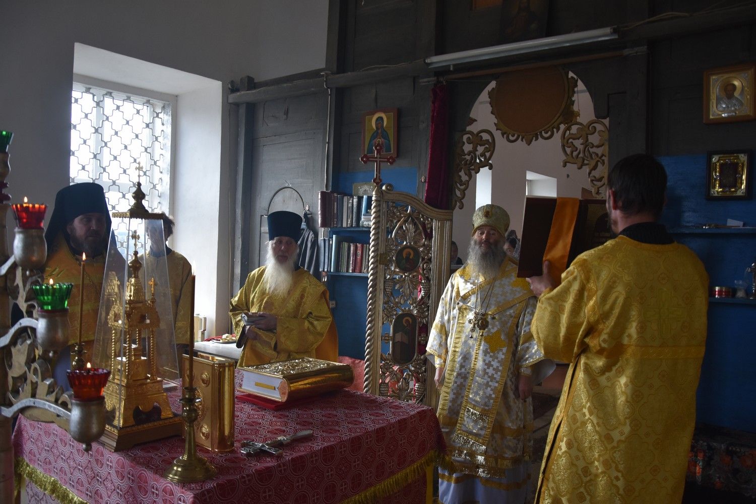 Владыке сослужили: секретарь Йошкар-Олинского епархиального управления иеромонах Серафим (Пасанаев), настоятель храма иерей Сергий Князев и клирик храма Рождества Пресвятой Богородицы села Семеновка протодиакон Михаил Козловский.