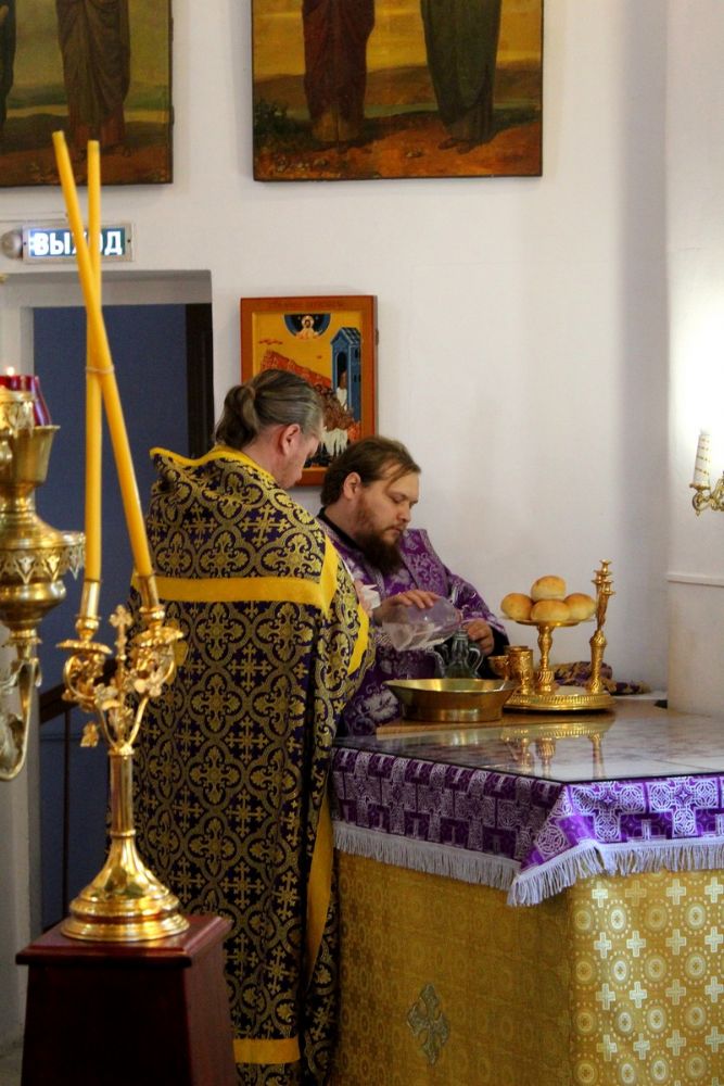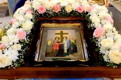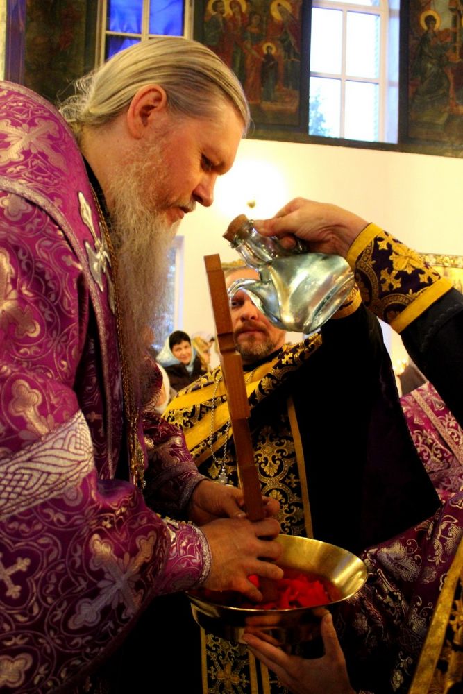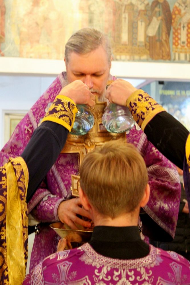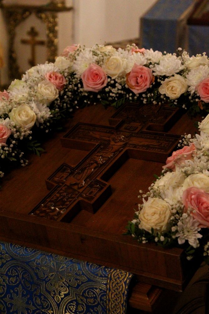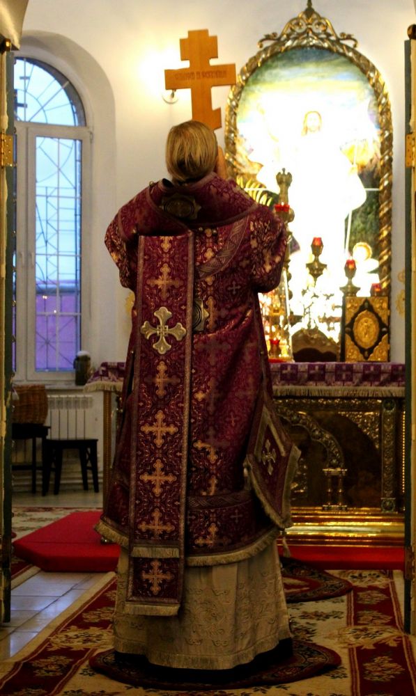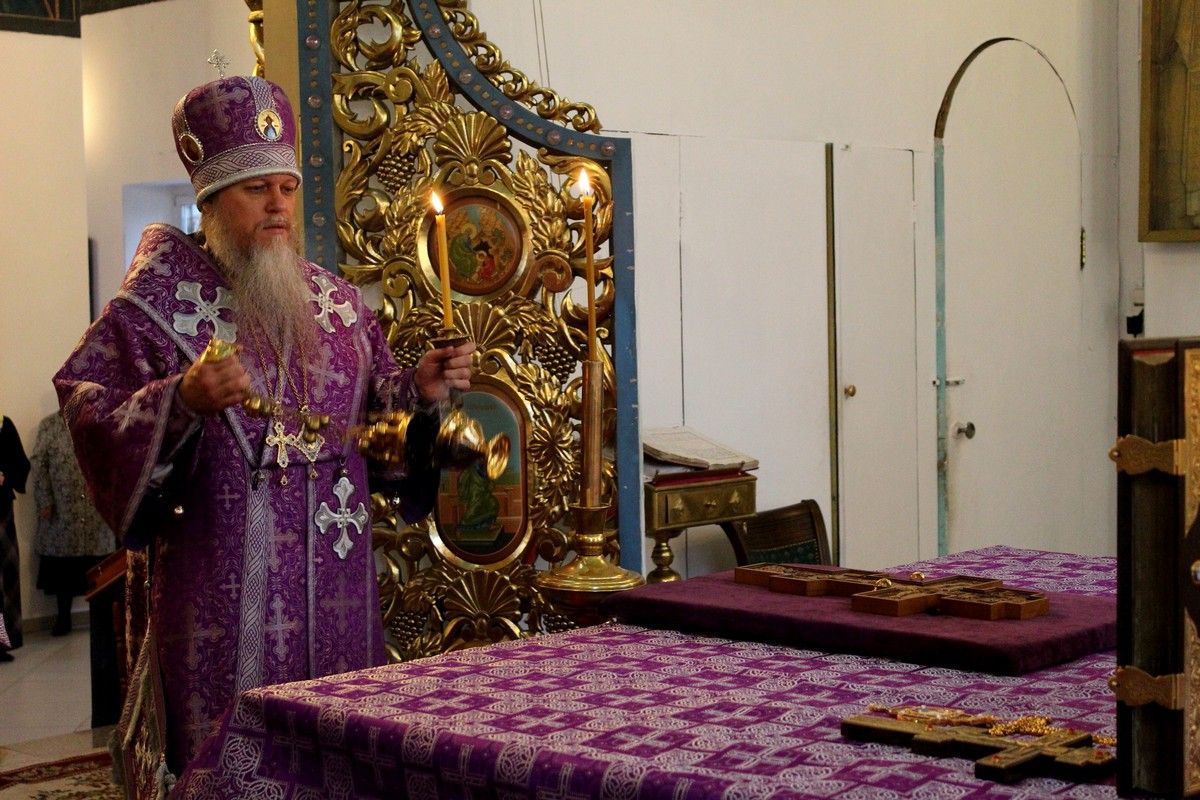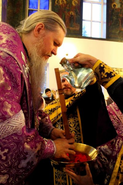 В завершение пения великого славословия архипастырь в сопровождении сослужащих священников торжественно вынес крест на середину храма. Владыка Феофан совершил чин воздвижения Креста Господня.