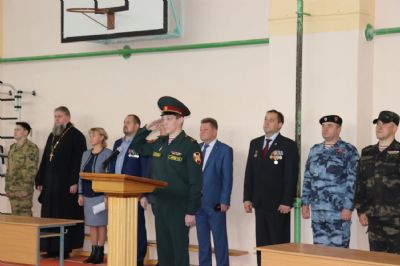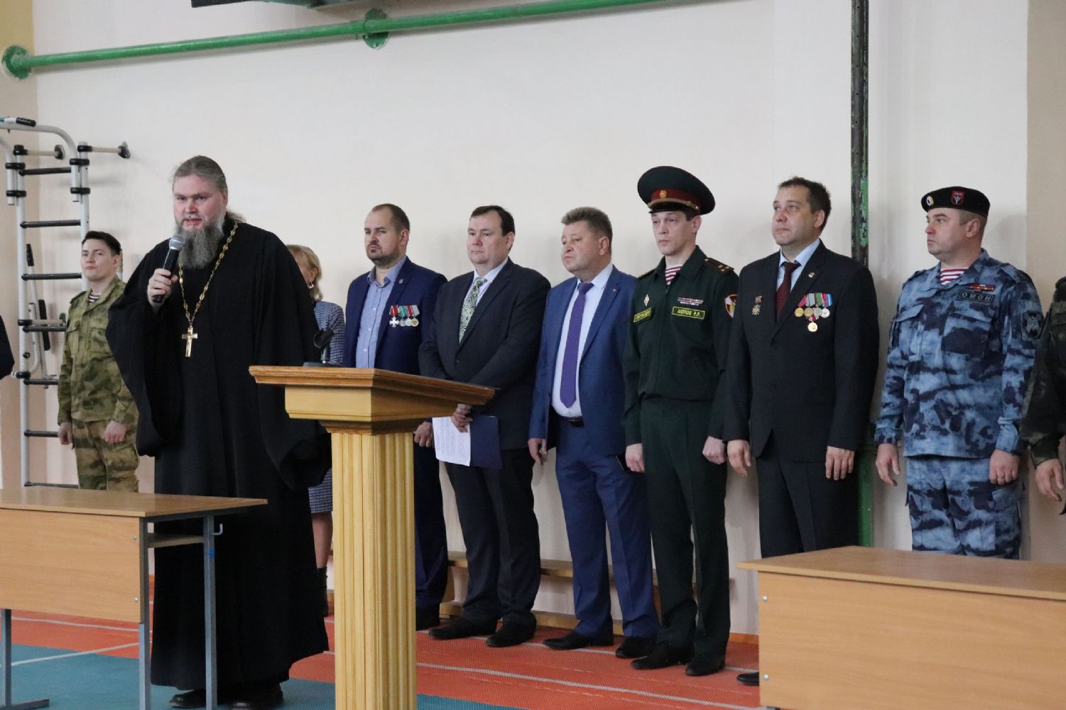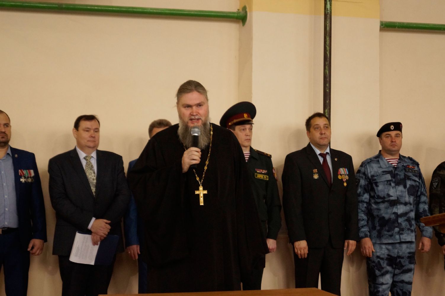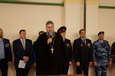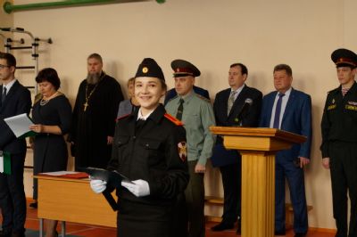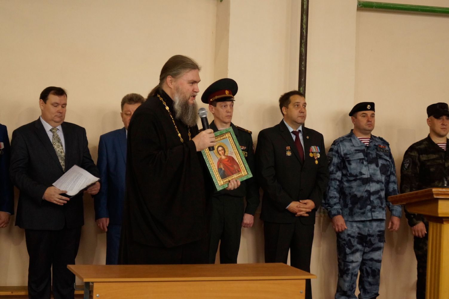 В числе приглашенных на мероприятии присутствовал настоятель храма Серафима Саровского протоирей Александр Бачурин. В своем приветственном слове священник благословил и поздравил юных кадетов: «Мы надеемся, что в вашем юном, радостном лице мы будем видеть тех, кто будет действительно опорой и защитой нашему Отечеству, и пусть небесное воинство благословит и подсобит вам в этом великом деле, а ваше сердце, духовно окрыляясь, действительно послужит для прославления нашего Отечества, для его защиты и мирной жизни» - сказал священнослужитель и преподнес икону Георгия Победоносца чтобы святой небесный покровитель хранил, вразумлял и наставлял юных защитников Отечества.