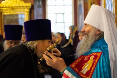 За Литургией митрополиту Иоанну сослужили секретарь Йошкар-Олинского епархиального управления иеромонах Серафим (Пасанаев), настоятель Казанского храма д. Нурма иерей Александр Коваль, клирик храма Рождества Пресвятой Богородицы с. Семеновка протодиакон Михаил Козловский и клирик Благовещенского кафедрального собора диакон Игорь Коваль. Песнопения исполнял мужской хор храма Сретения Господня с. Кучки.