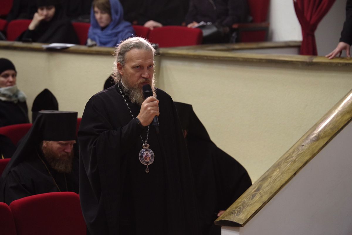 Далее участники встречи обсудили особенности монастырского богослужения, его практические аспекты. Сообщения на эту тему представили настоятель нижегородского Благовещенского монастыря архимандрит Александр (Лукин) («Современные практики совершения суточного богослужебного круга и литургии») и насельник нижегородского Вознесенского Печерского монастыря игумен Вассиан (Бирагов) («Значение келейного правила для духовного делания, подготавливающего к участию в богослужении и как части богослужебного круга»).