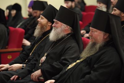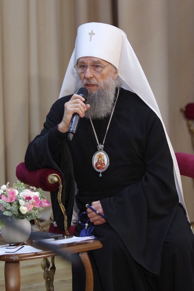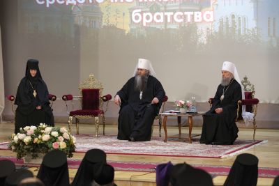 В президиуме встречи вместе с ним находились митрополит Саранский и Мордовский Зиновий и настоятельница московского Зачатьевского ставропигиального монастыря игумения Иулиания (Каледа).