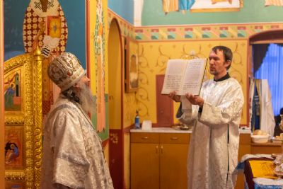 Владыке сослужили секретарь Йошкар-Олинского епархиального управления иеромонах Серафим (Пасанаев), ключарь Благовещенского собора протоиерей Сергий Поглазов и клирик храма Рождества Пресвятой Богородицы с. Семеновка протодиакон Михаил Козловский.
