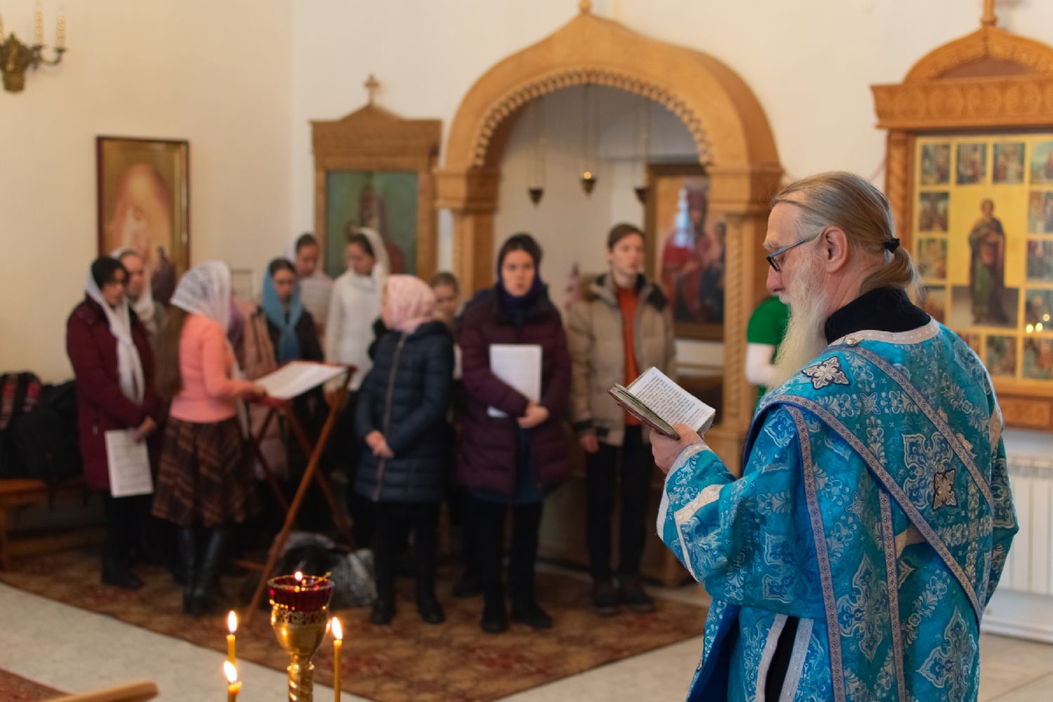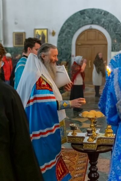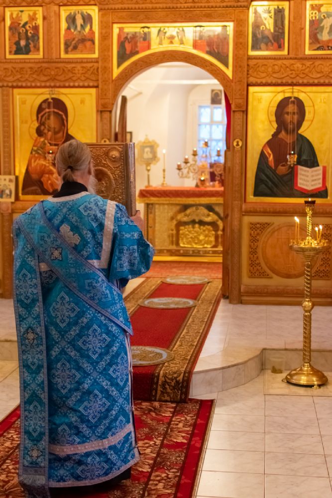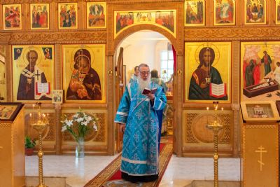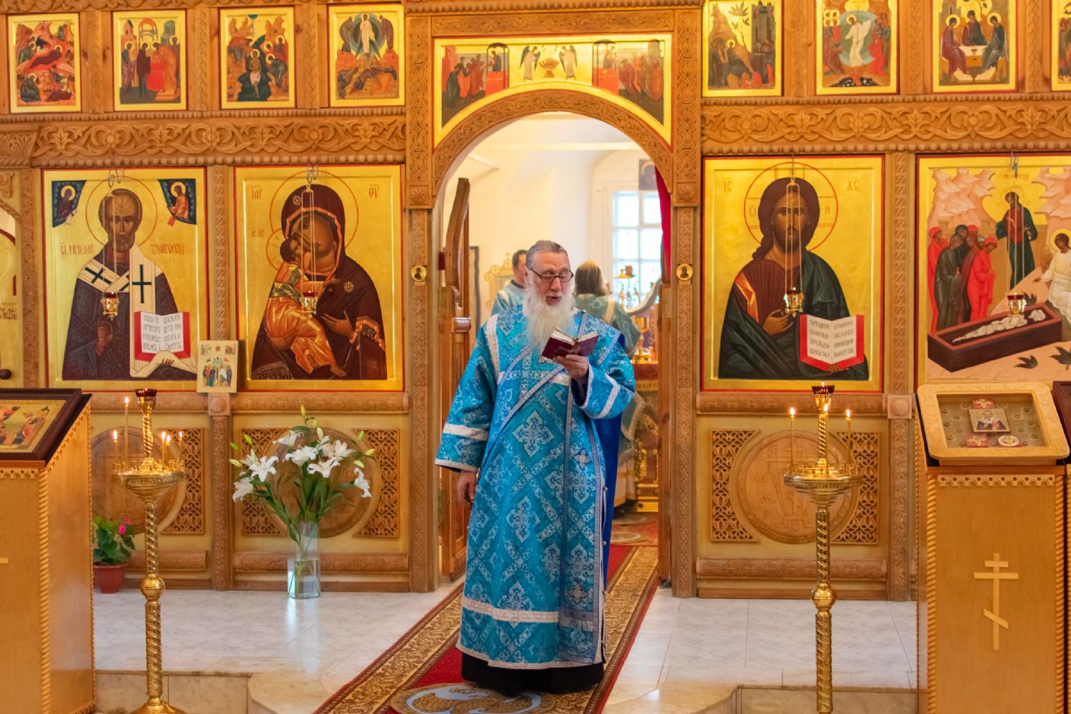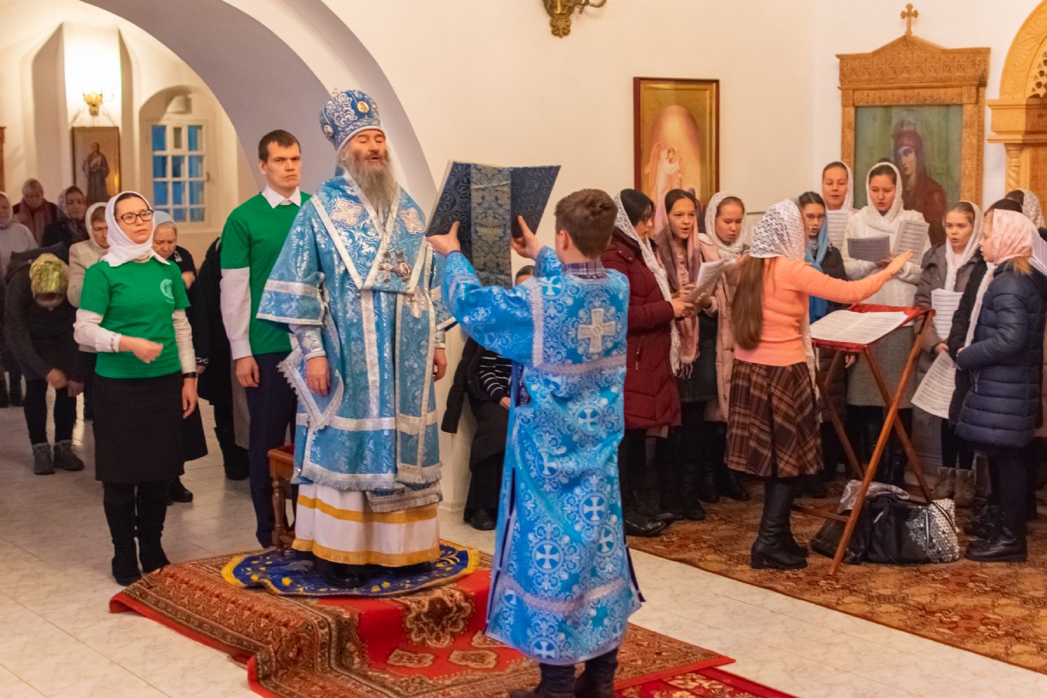 Богослужение началось тожественной встречей митрополита Иоанна и облачением в центре храма. На сугубой ектенье возносились прошения о единении Православной Церкви и молитва о мире на Украине.