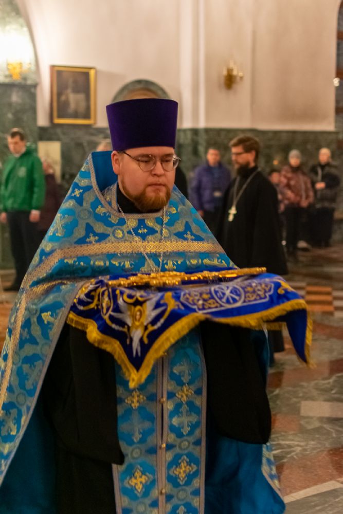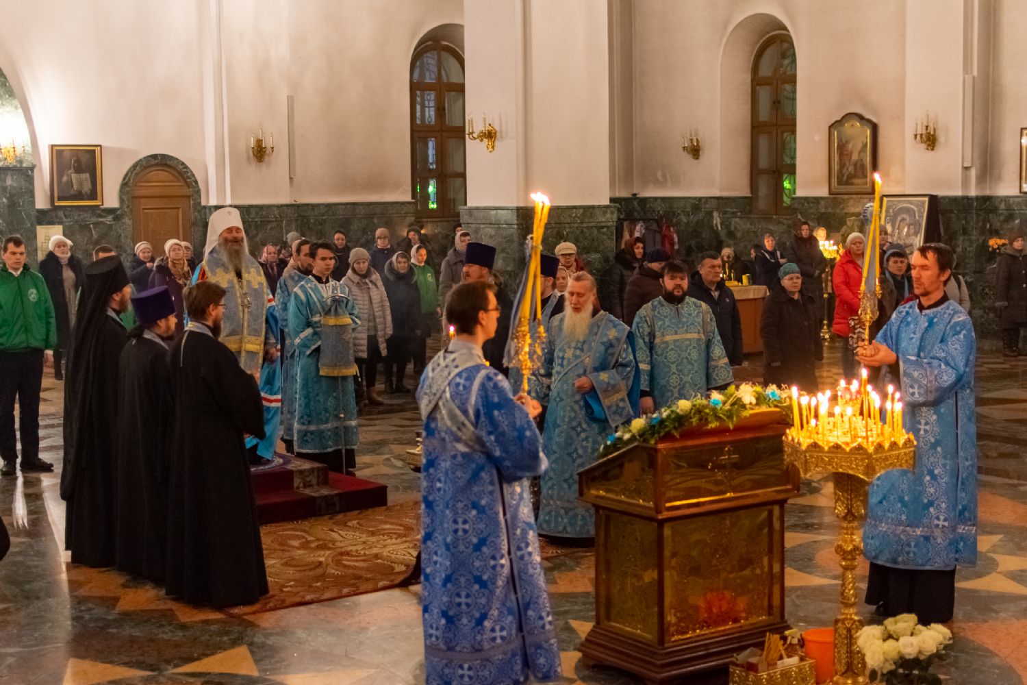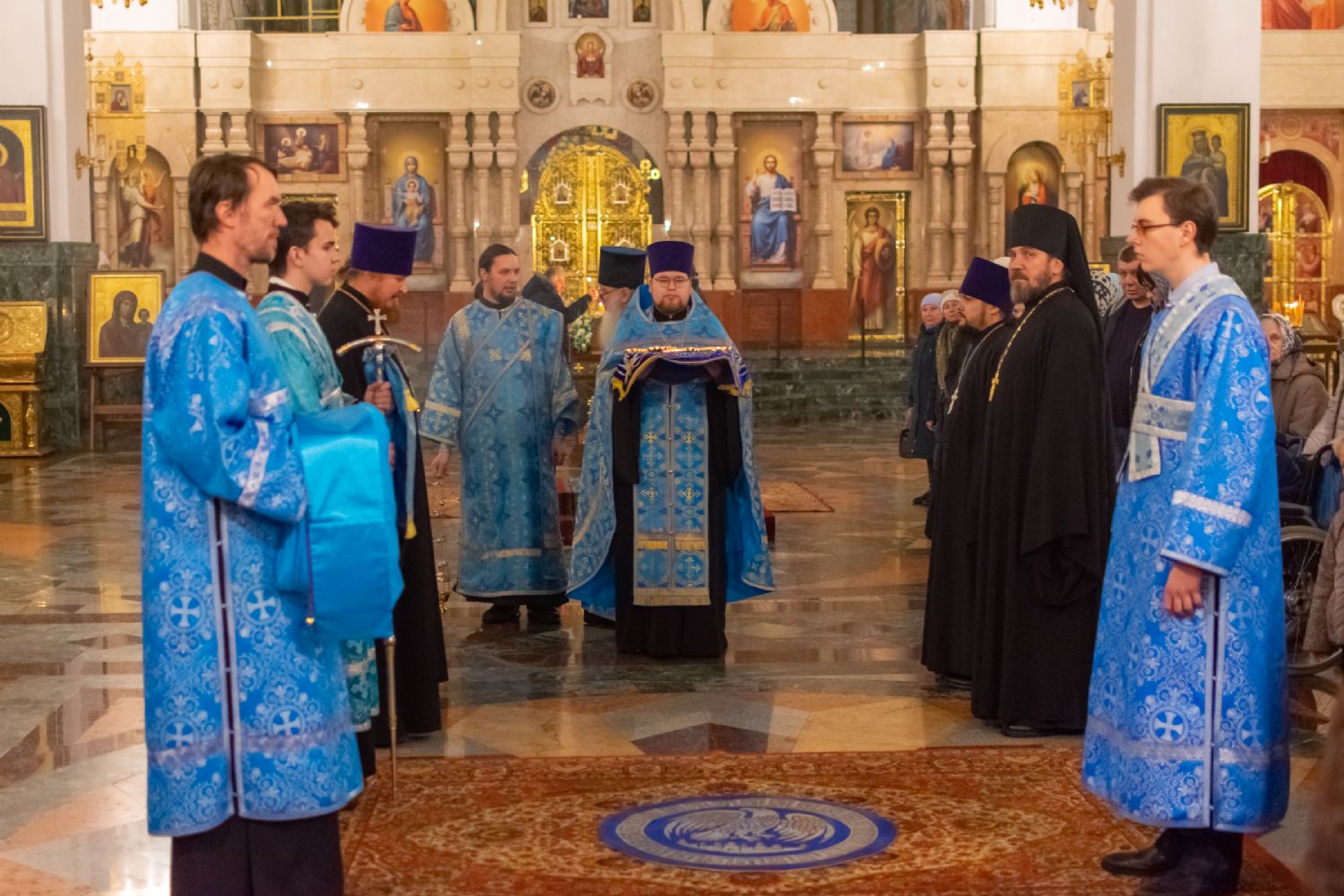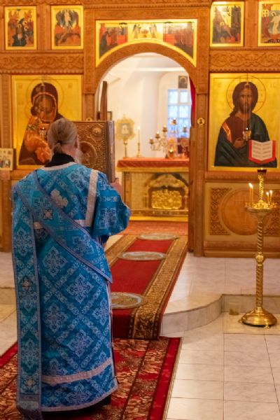 После Литургии Владыка с сослужащими совершил славление: пропели тропарь, кондак и величание празднику Введения во храм Пресвятой Богородицы.