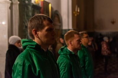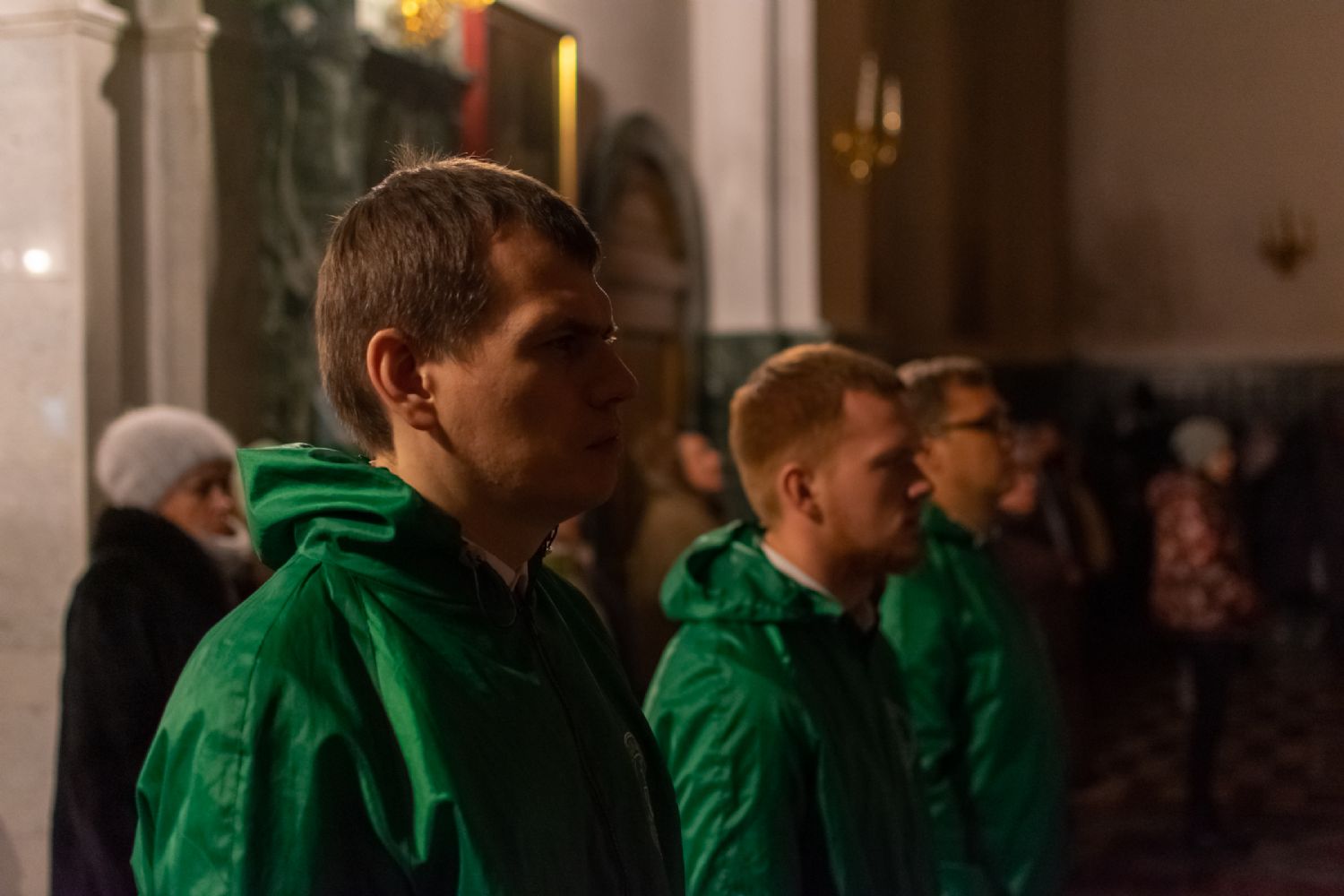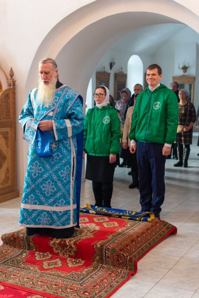 За Литургией Владыке сослужили секретарь Йошкар-Олинского епархиального управления иеромонах Серафим (Пасанаев), клирик монастыря иерей Михаил Лежнин и клирик храма Рождества Пресвятой Богородицы протодиакон Михаил Козловский. Песнопения исполнял детско-юношеский хор «Благовест» под руководством регента Надежды Поздеевой. За Божественной литургией помогали Православные добровольцы.