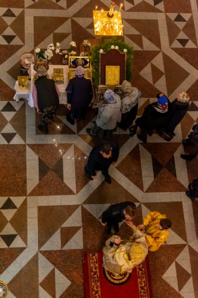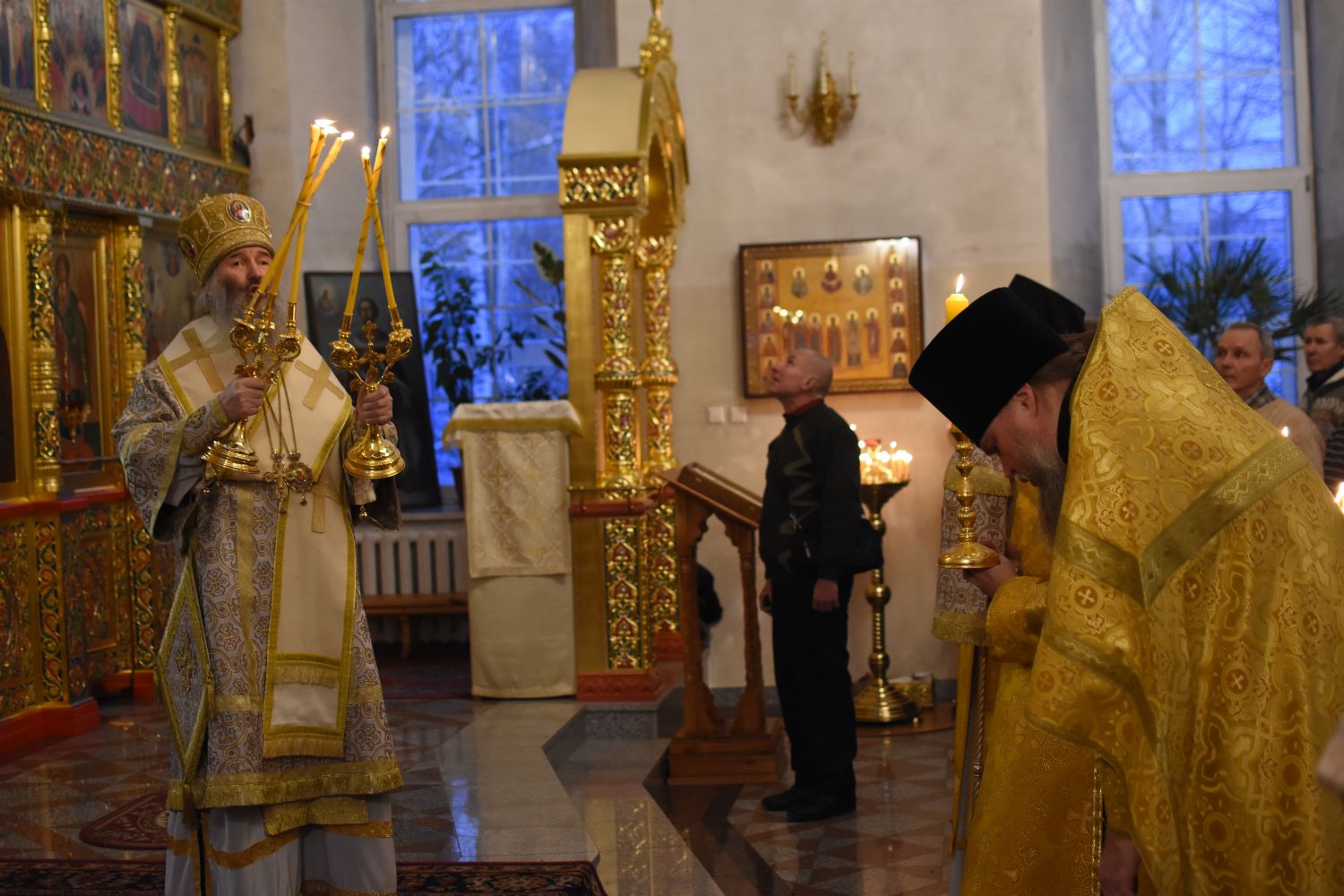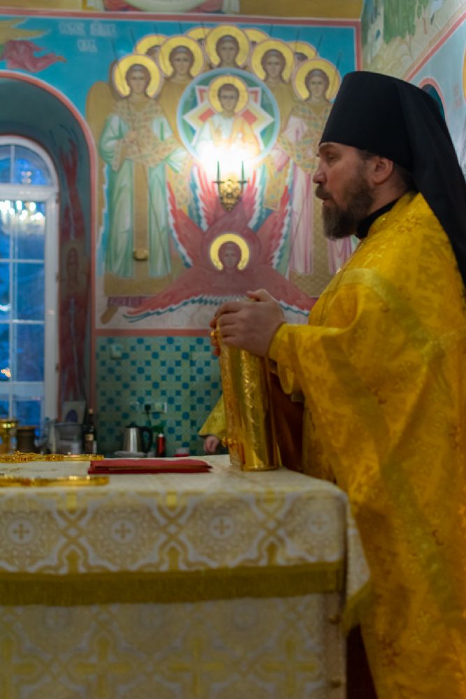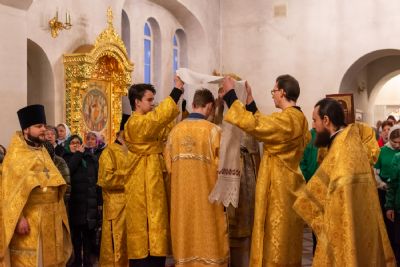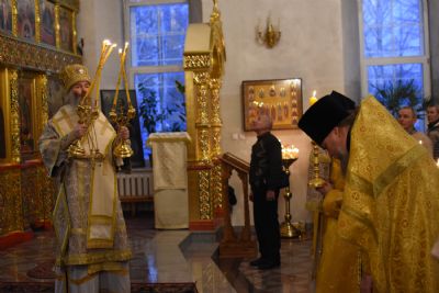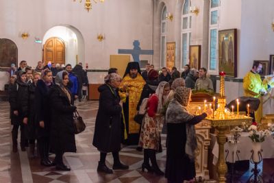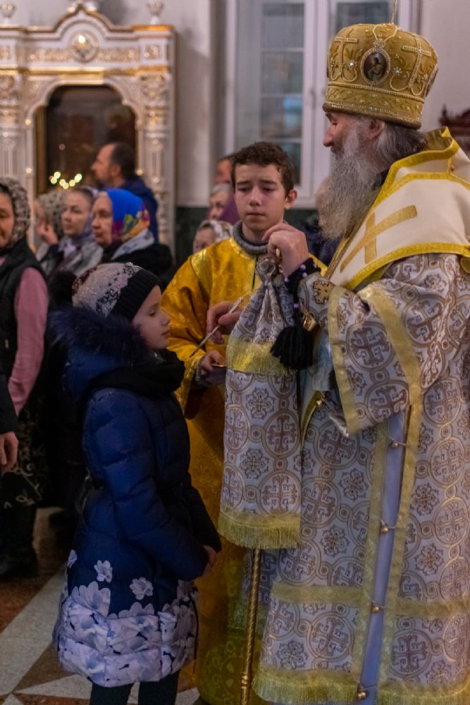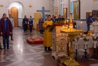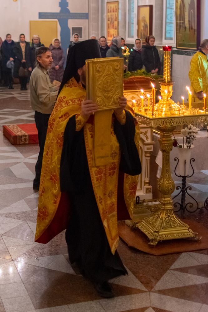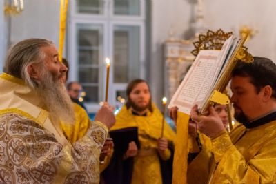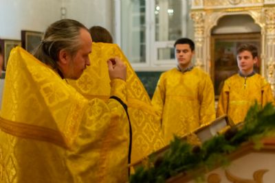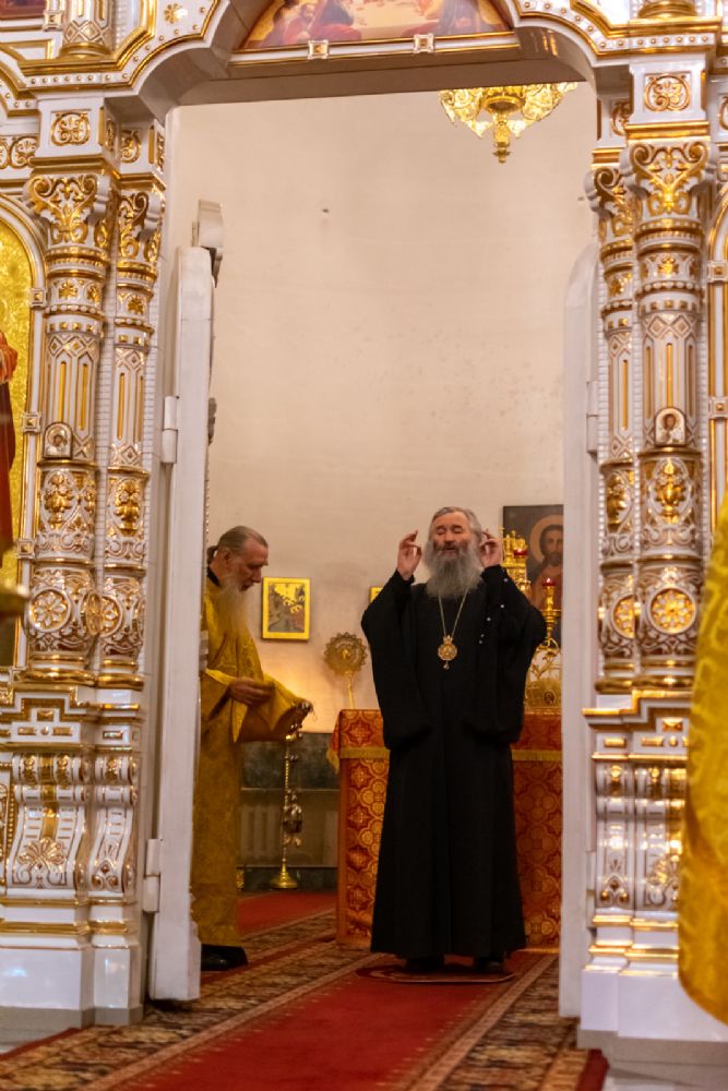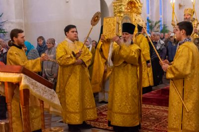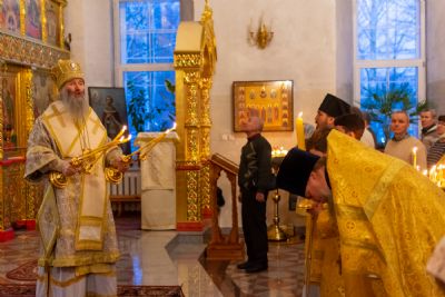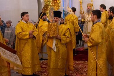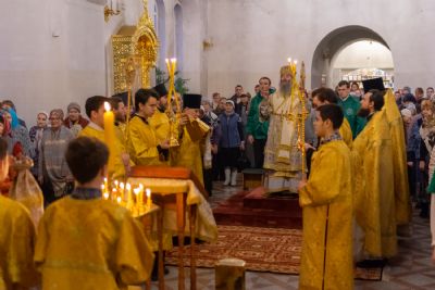За Всенощным бдением Владыке сослужили секретарь Йошкар-Олинского епархиального управления иеромонах Серафим (Пасанаев), настоятель собора иерей Алексий Кирюшкин, клирики собора иереи Леонид Вылекжанин, Андрей Кончаков, диакон Алексий Кузнецов и клирик храма Рождества Пресвятой Богородицы с. Семеновка протодиакон Михаил Козловский. Песнопения исполнял хор собора.